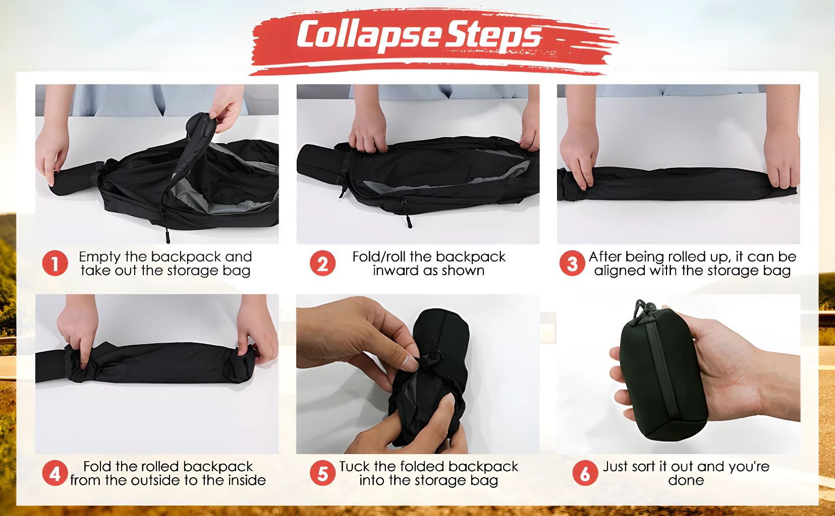- 5️⃣ Guarde la mochila plegada dentro de su bolsa de almacenamiento.