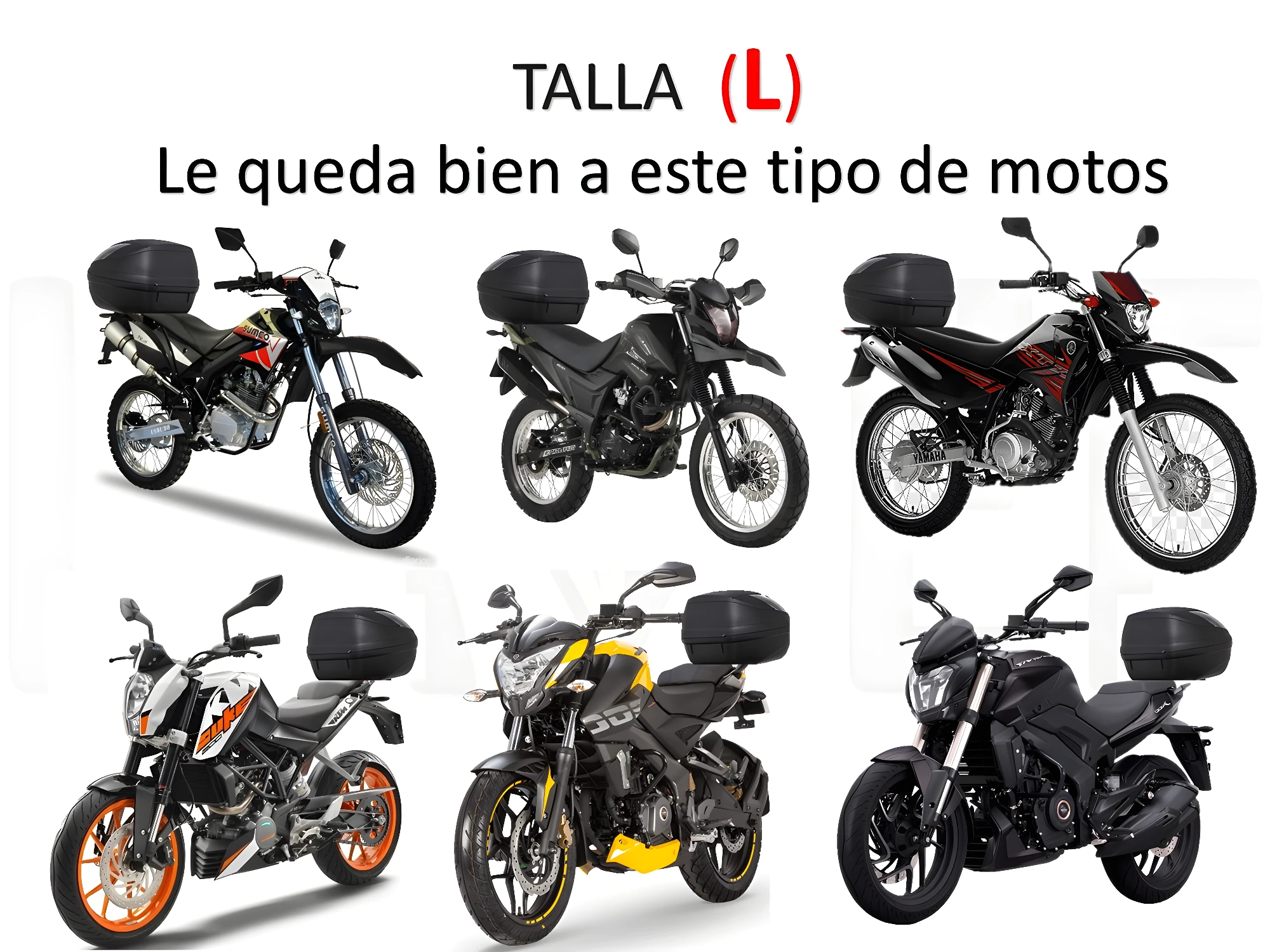 - La talla L está diseñada para una amplia variedad de motocicletas que tienen un maletero (top case) instalado, como se muestra en la imagen del producto. Se ajusta bien a modelos tipo naked, sport y enduro de tamaño mediano a grande. Sus medidas específicas son 240 cm de largo y 110 cm de ancho, brindando una cobertura adecuada.