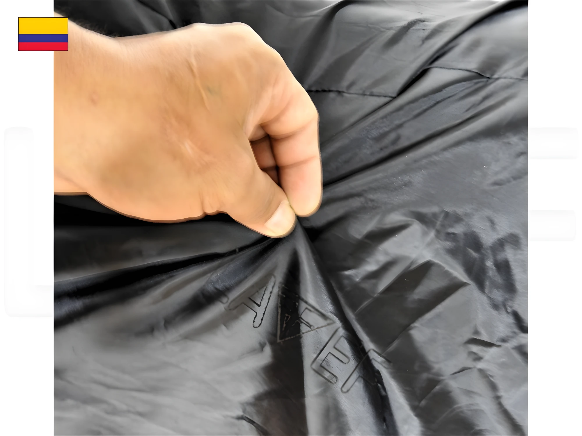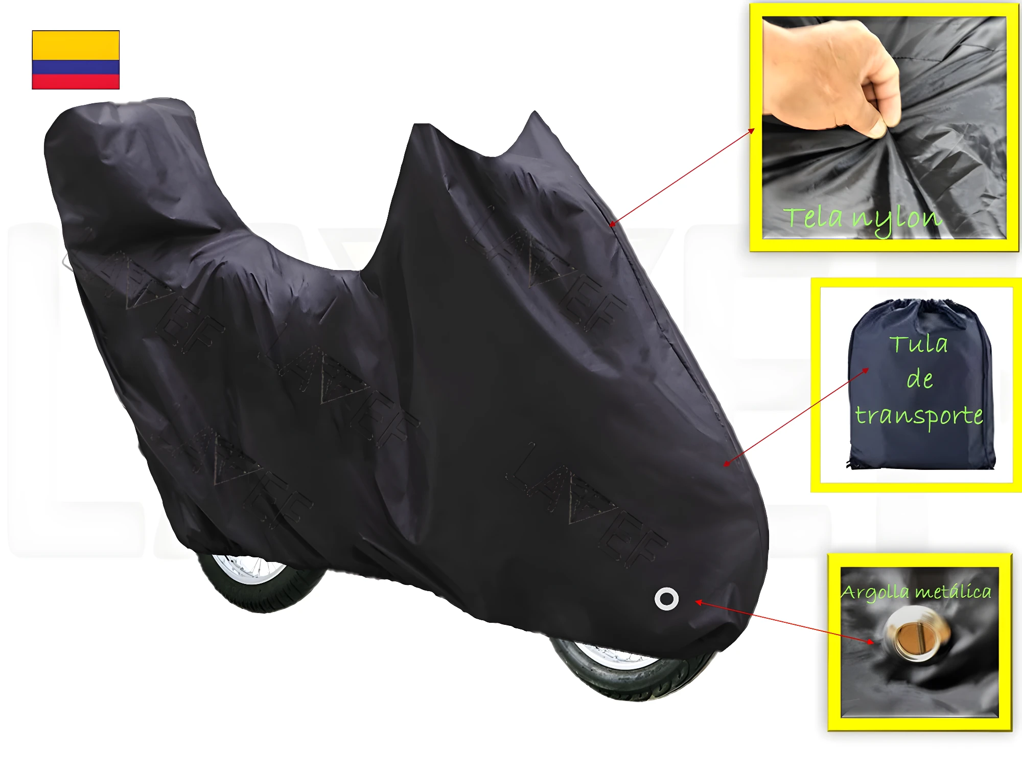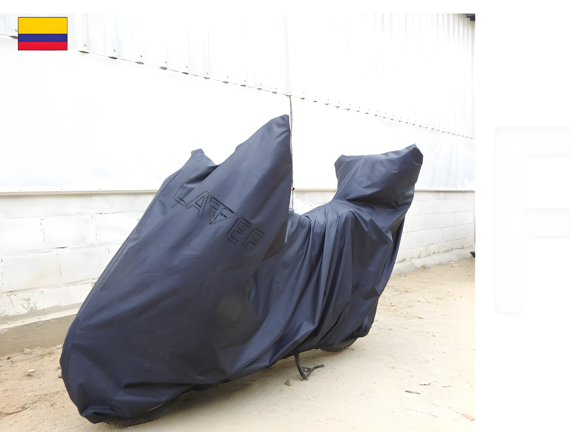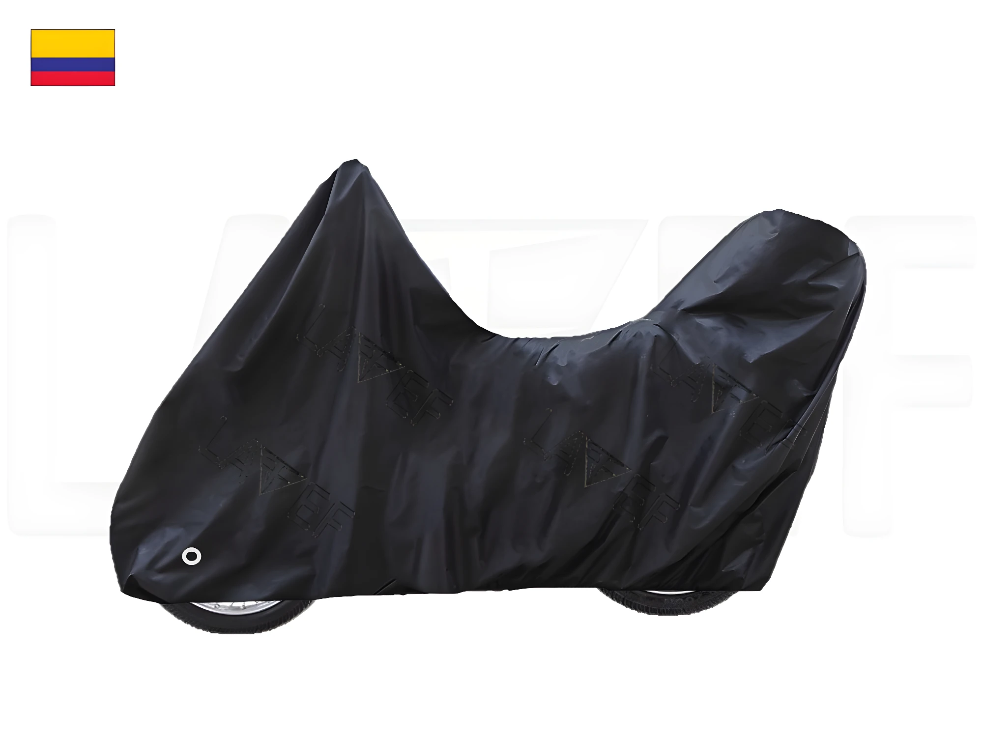 - La carpa incorpora un resorte elástico en su base que asegura un ajuste ceñido, evitando que se vuele con el viento. Adicionalmente, cuenta con una argolla metálica en la parte inferior, ideal para pasar un candado de guaya y aumentar la seguridad de su moto y de la carpa misma.