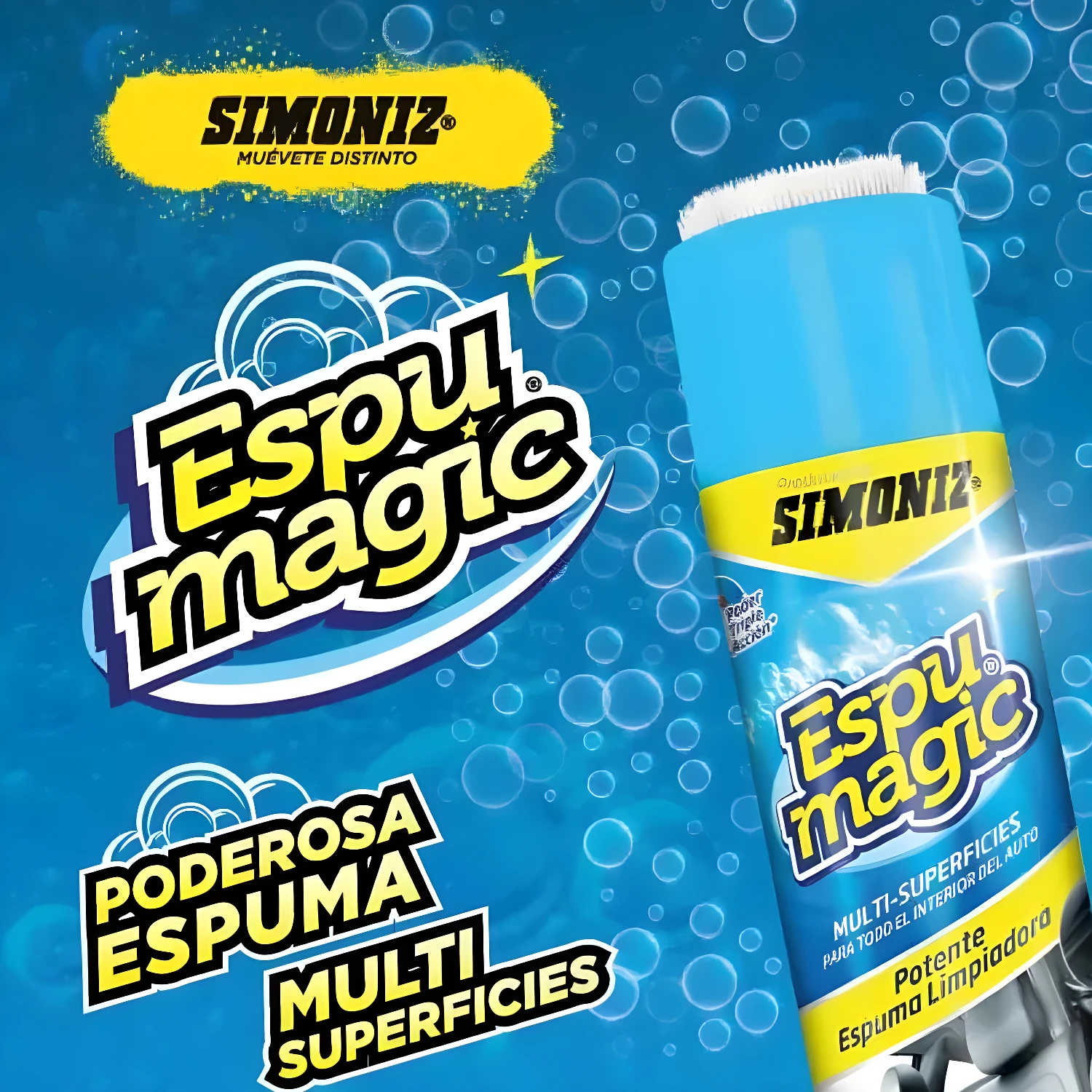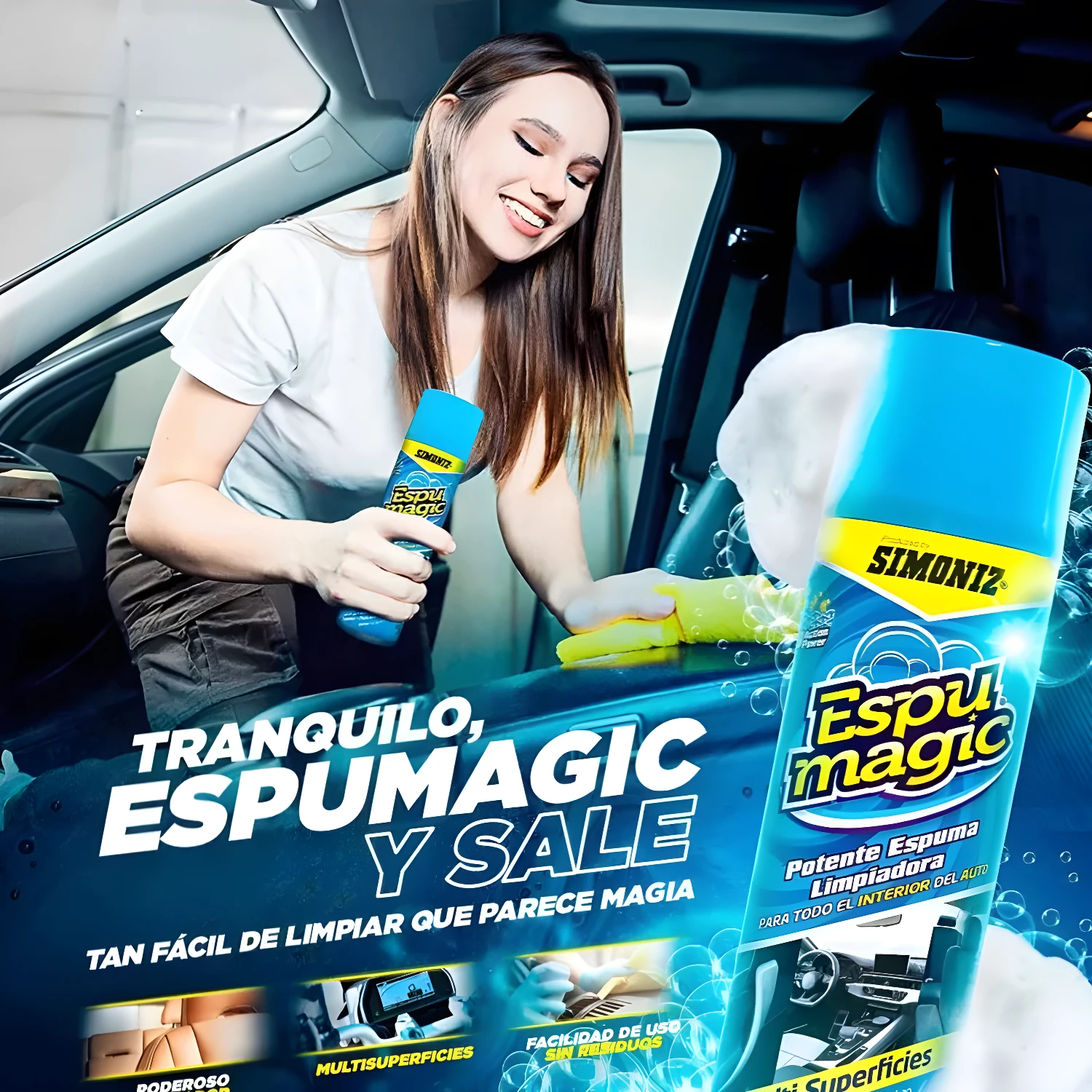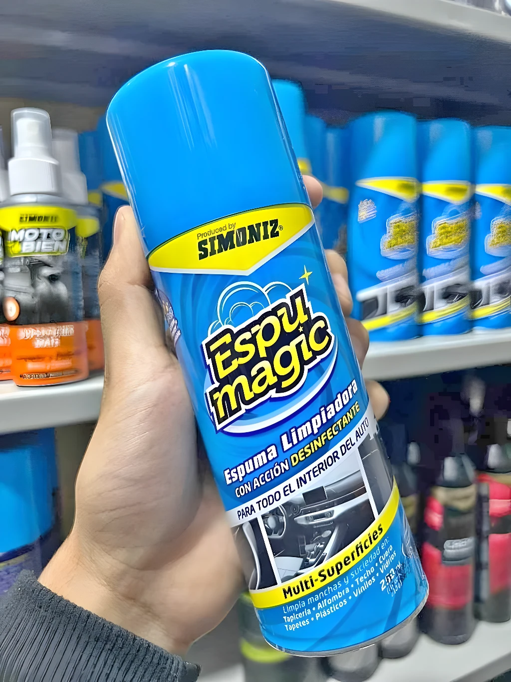 ✨ Descubre la potencia de ESPUMAGIC®, el limpiador en espuma multisuperficies que transforma la limpieza en una tarea rápida y eficiente. 🚗 Su fórmula innovadora penetra profundamente para eliminar manchas de suciedad, grasa y polvo, dejando tus superficies impecables y frescas, ya sea en tu vehículo o en el hogar. 🌟