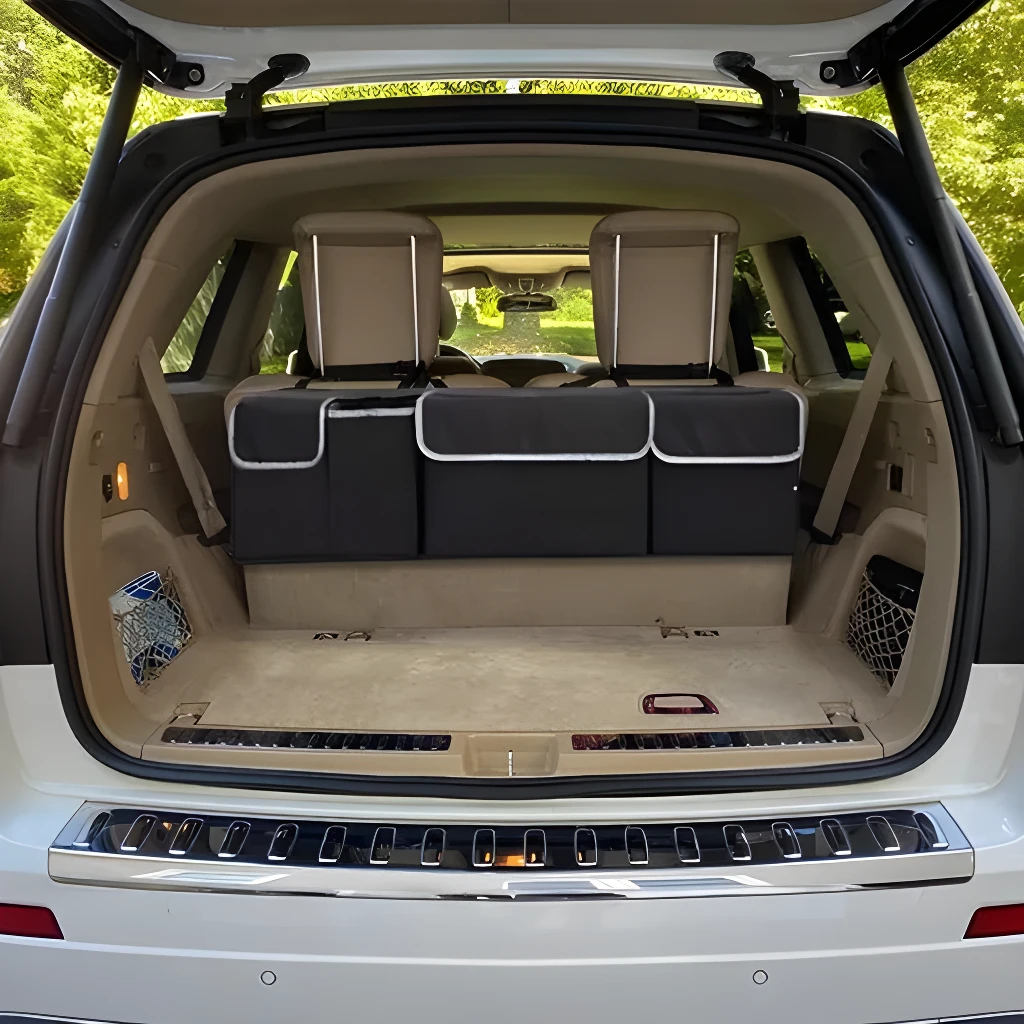 - ✅ Diseño Colgante Innovador: Aprovecha el espacio vertical del maletero al fijarse en la parte trasera de los asientos, liberando el suelo para objetos más grandes como maletas, coches de bebé o equipos deportivos.