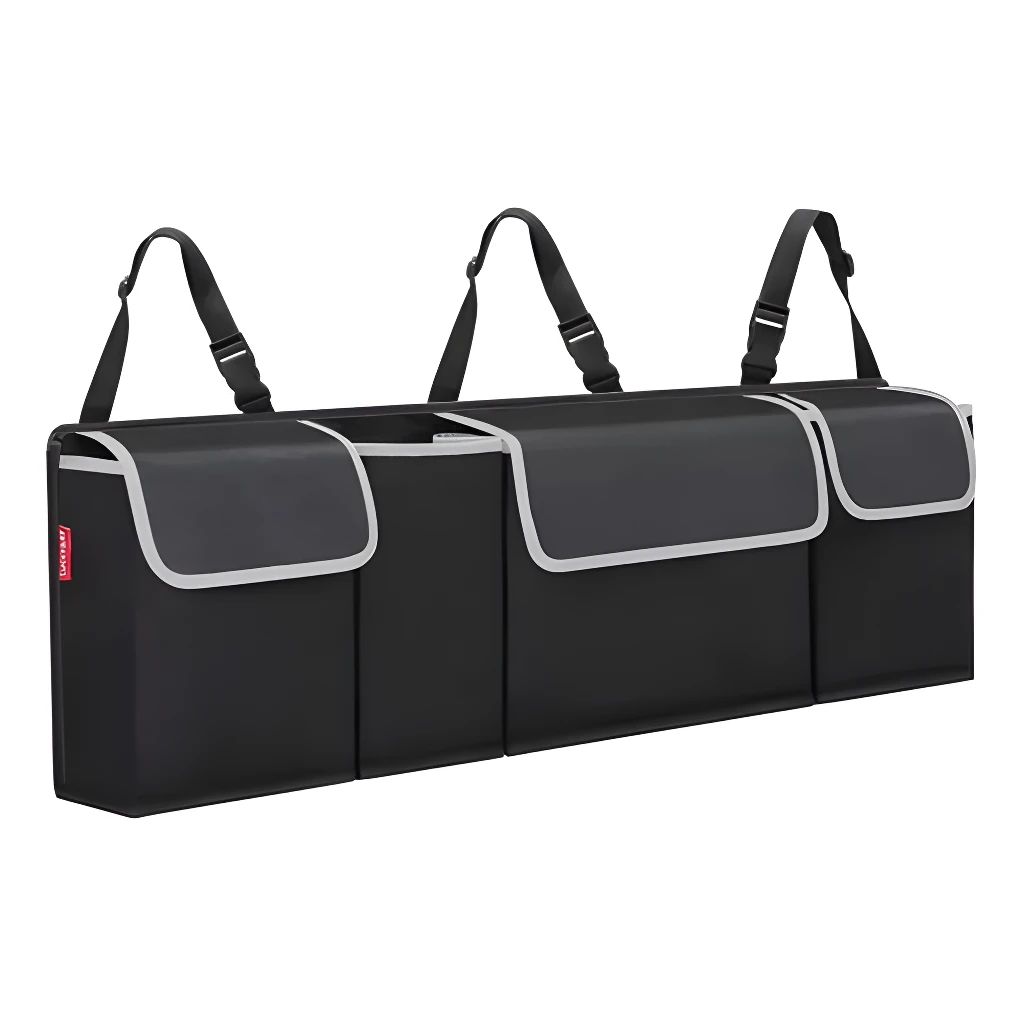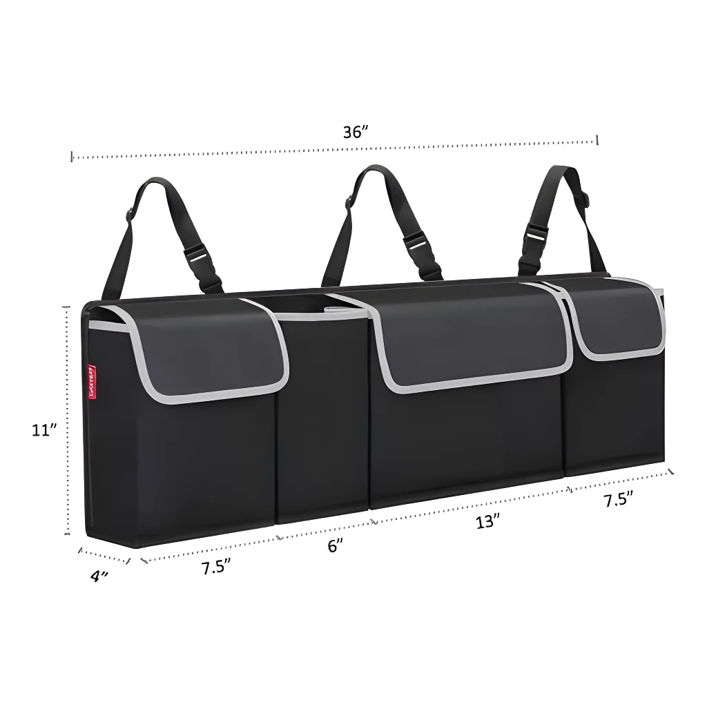 - El organizador cuenta con 4 compartimentos principales, incluyendo tres con solapa y uno abierto centralmente. Ofrece una variedad de bolsillos de diferentes tamaños perfectos para guardar desde herramientas y equipo de emergencia hasta juguetes para niños, suministros para mascotas, compras del supermercado y artículos deportivos.