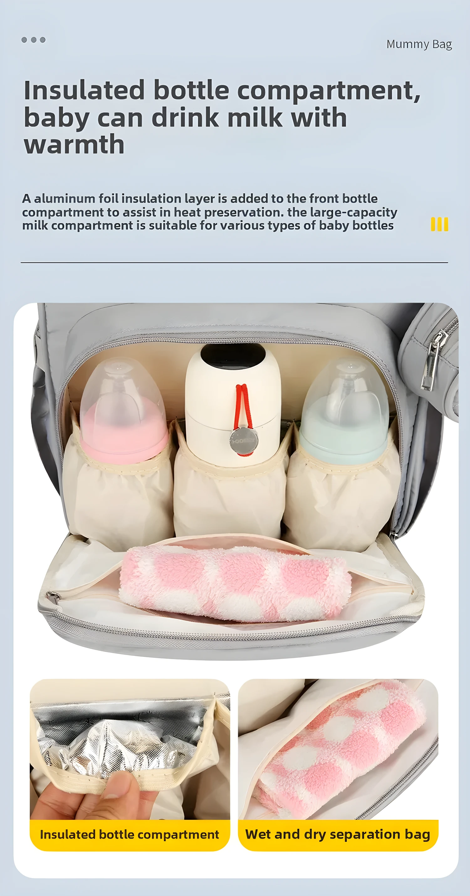 - ✅ Bolsillos Térmicos Aislados: Múltiples compartimentos con una capa de aislamiento de aluminio en la parte frontal para mantener los biberones y alimentos del bebé a la temperatura ideal por más tiempo.