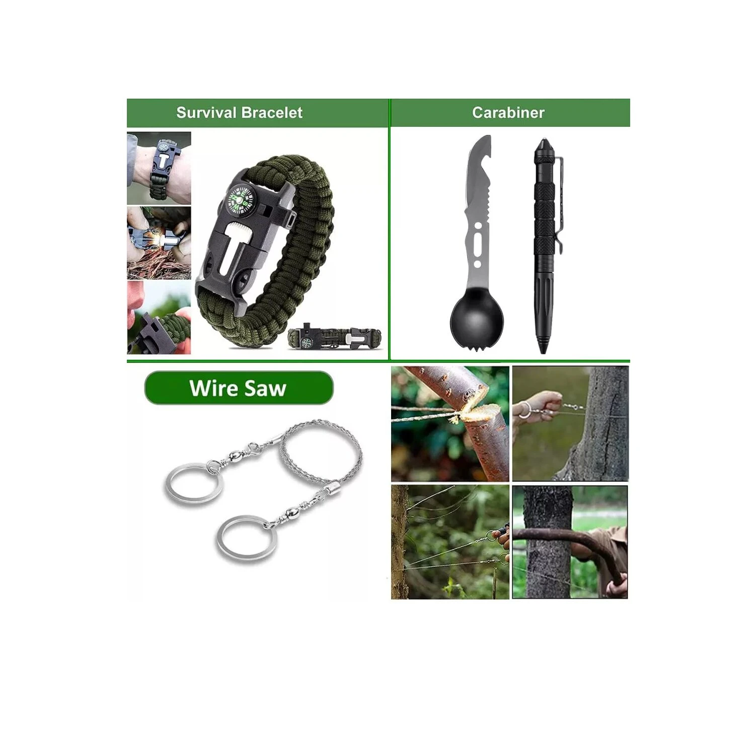 - ✅ Sierra de Mano de Alambre: Corta madera y otros materiales para construir refugios o preparar leña de forma ligera y eficiente.