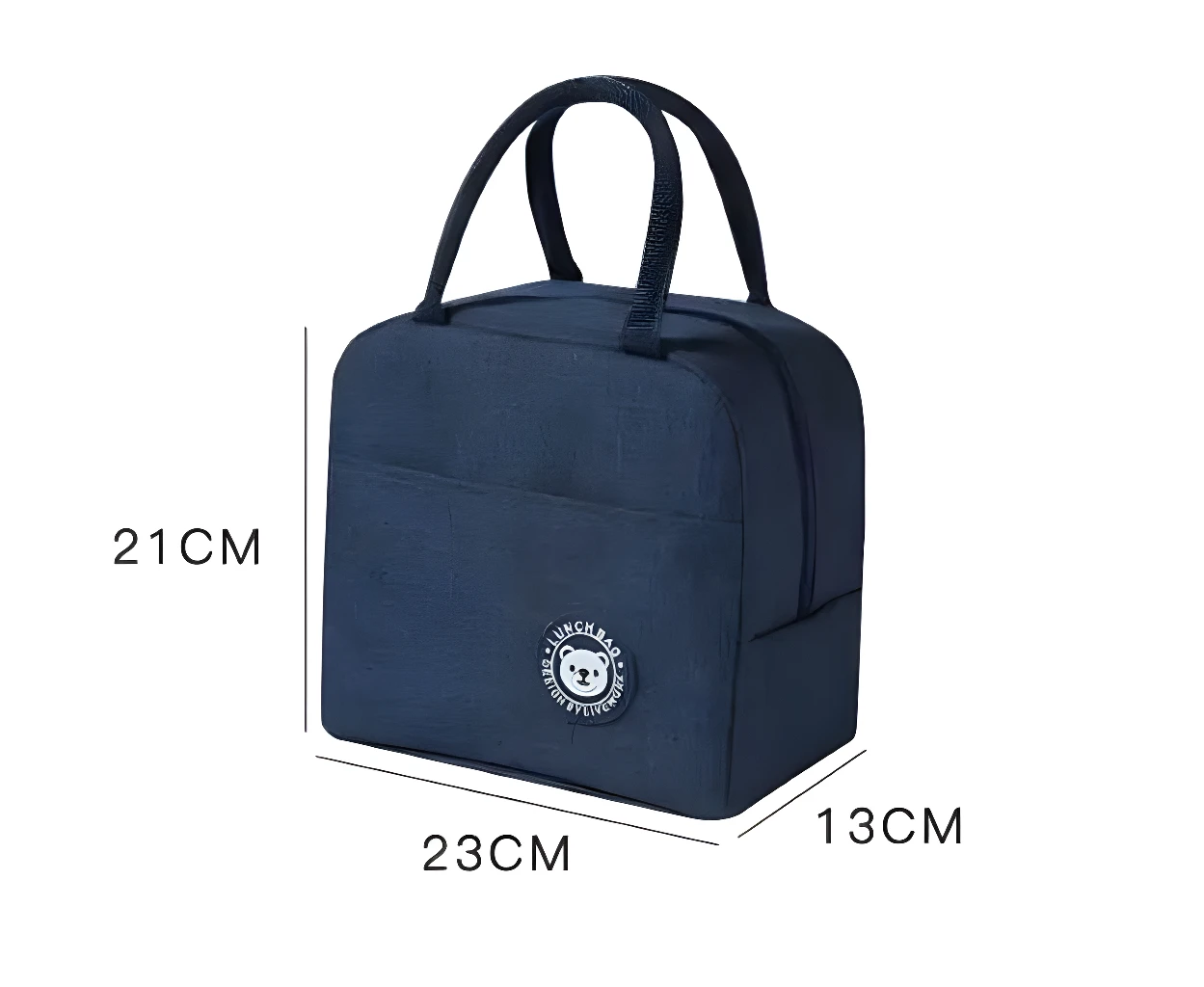 - Esta lonchera tiene las siguientes medidas: 21 cm de alto (que se extienden a 34 cm si se incluyen las agarraderas levantadas), 23 cm de ancho y 13 cm de fondo. Estas dimensiones la hacen práctica para llevar sus comidas de forma organizada.