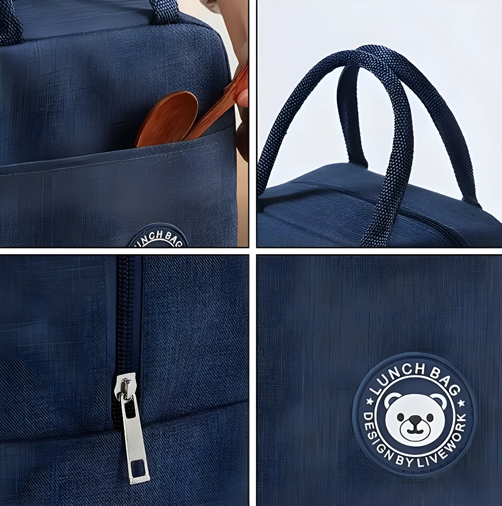 - La lonchera está fabricada con tela Oxford de alta calidad en su exterior, lo que le confiere una excelente resistencia al desgaste diario. Su interior cuenta con un revestimiento de aluminio que proporciona un óptimo aislamiento térmico, garantizando una gran durabilidad para el uso constante.