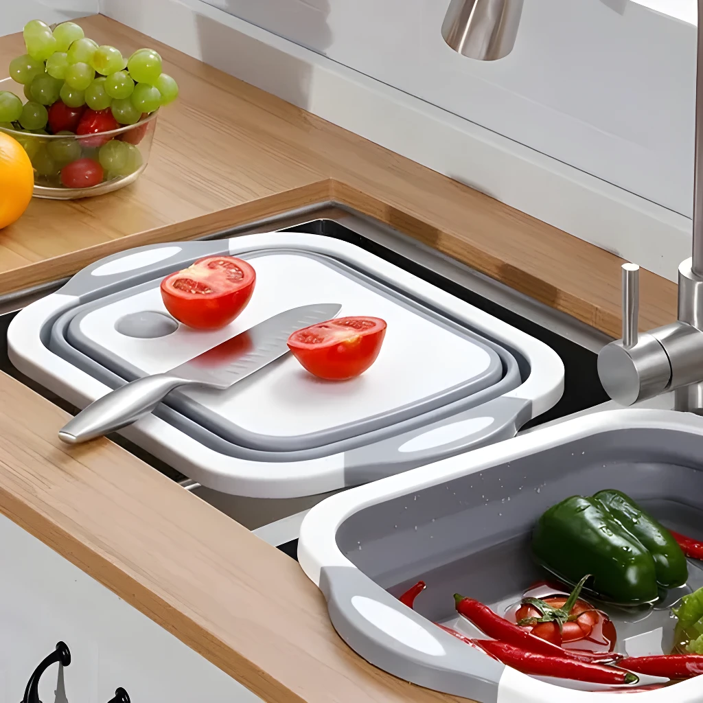 ✨ Transforma tu cocina con la tabla multifuncional con escurridor, una solución innovadora 🧽, práctica 🍎 y ahorradora de espacio 🏠. Ideal para lavar, cortar y almacenar alimentos, esta tabla se convertirá en tu mejor aliado en la cocina.