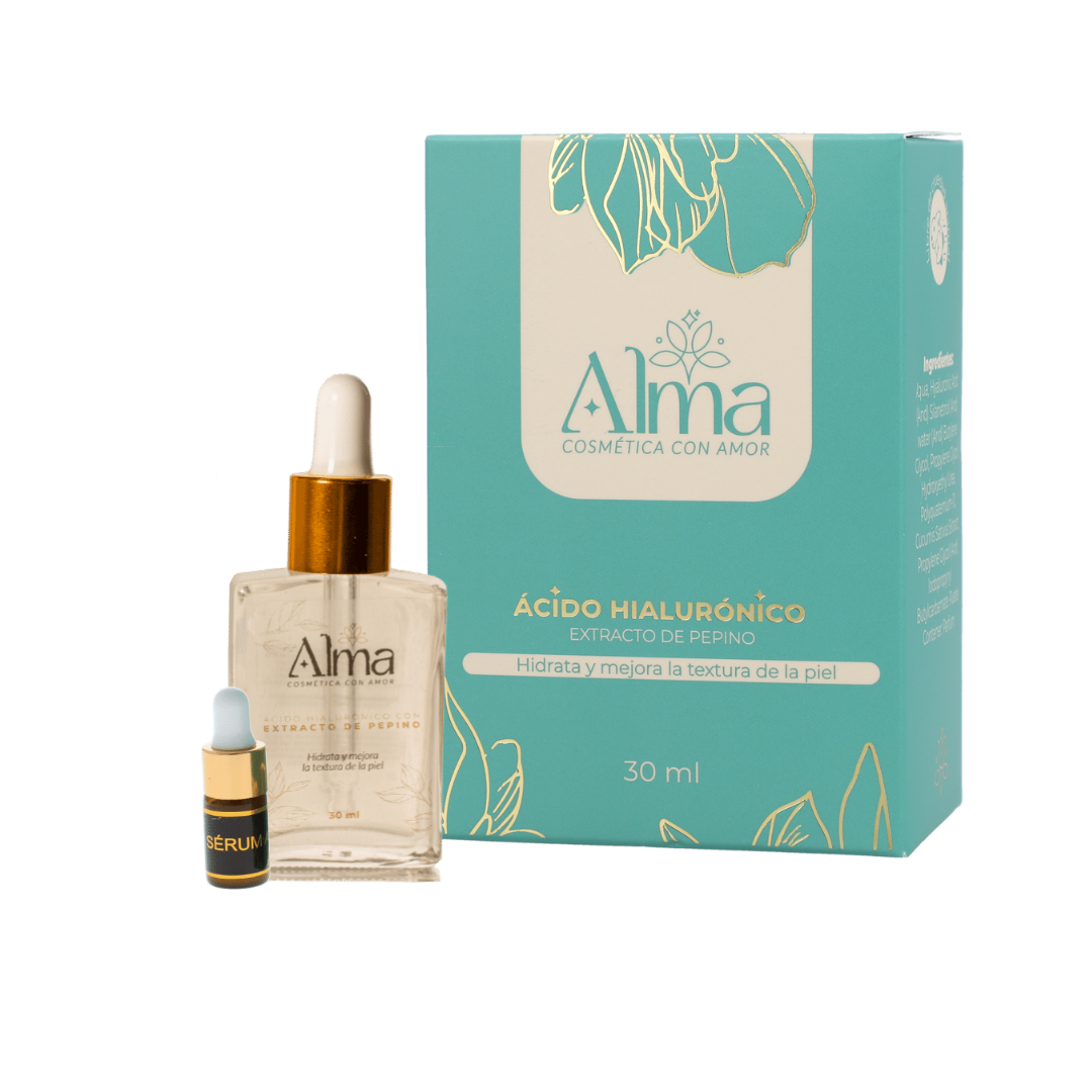 💧 Descubre el poder del SÉRUM DE ÁCIDO HIALURÓNICO con Extracto de Pepino de Alma Cosmética, formulado especialmente para hidratar en profundidad y mejorar la textura de la piel. Este sérum, con una concentración del 4% de ácido hialurónico, ayuda a reforzar la producción de colágeno y a incrementar la renovación celular, proporcionando una piel visiblemente más suave y rejuvenecida. Su fórmula ultraligera de rápida absorción lo hace ideal para todo tipo de piel, ofreciendo un cuidado diario tanto de día como de noche.