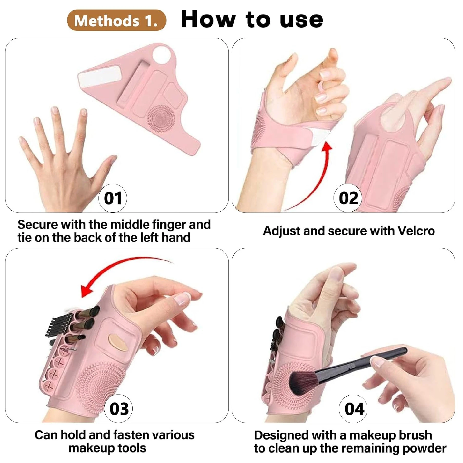- Este innovador accesorio multifuncional está diseñado para organizar sus brochas y paletas de maquillaje directamente en su mano. Además, le proporciona una superficie práctica para mezclar productos o limpiar el exceso de sus brochas durante la aplicación.