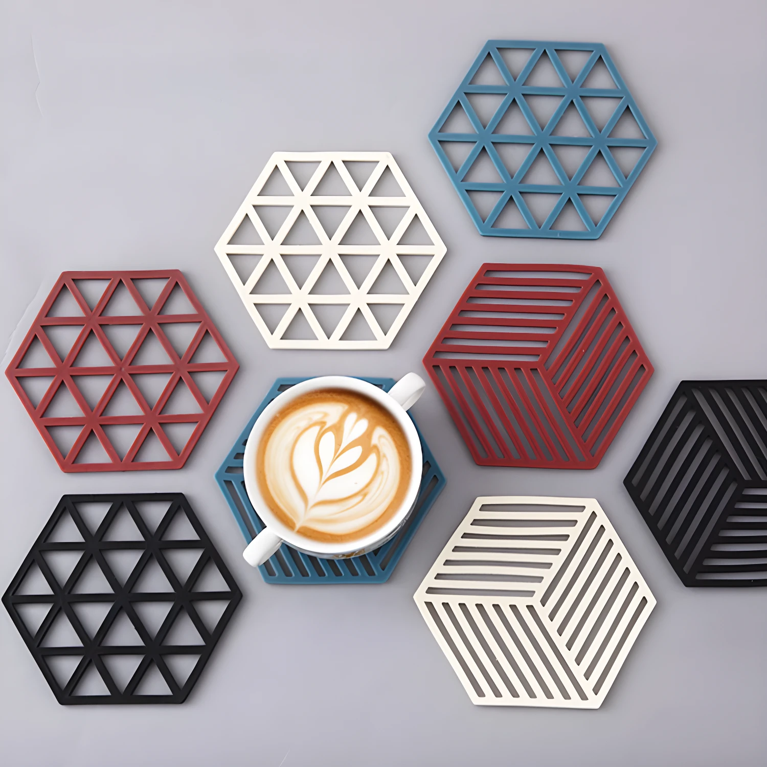 - El set incluye cuatro posavasos de silicona. Vienen con diseños hexagonales surtidos, que incluyen el patrón triangular y el de líneas con efecto 3D, y pueden presentar una variedad de colores vibrantes para complementar su decoración.