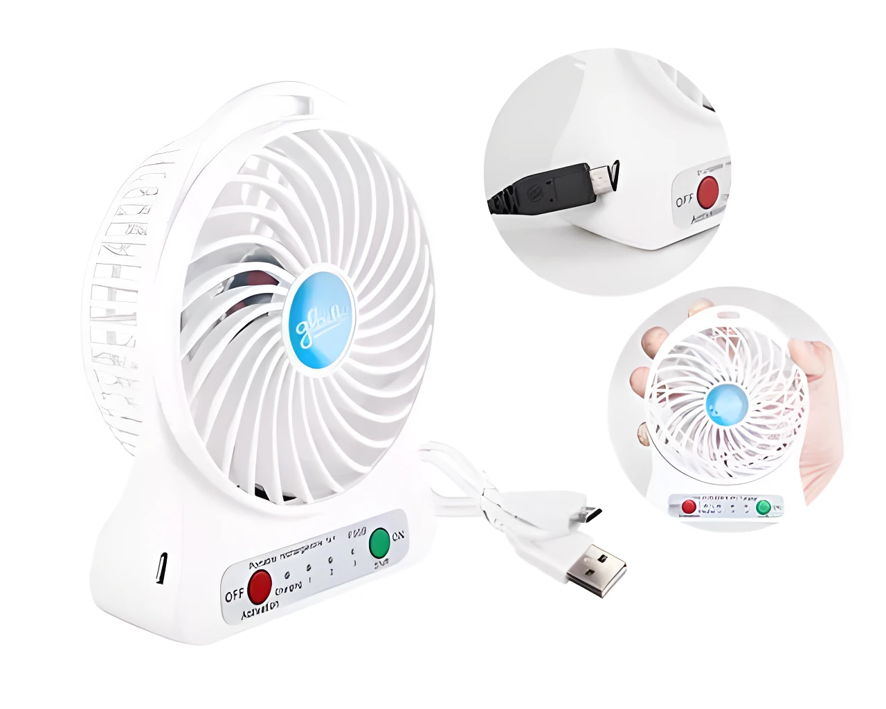 - El mini ventilador cuenta con 3 velocidades ajustables que le permiten personalizar el flujo de aire según su preferencia, brindando una brisa cómoda y refrescante.