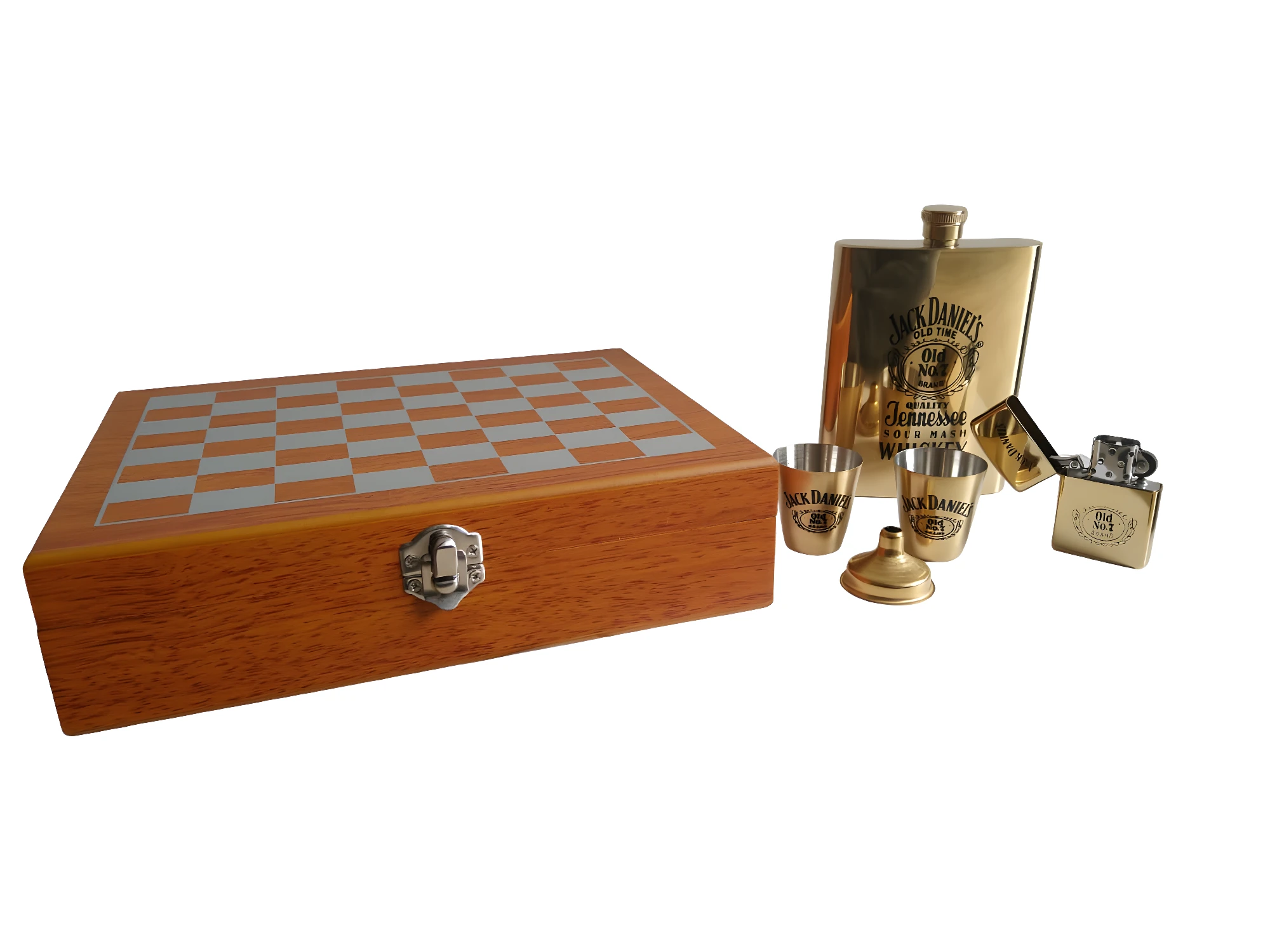 - ¿Qué elementos se incluyen en este Set De Licorera Jack Daniels Dorado En Cofre De Ajedrez?