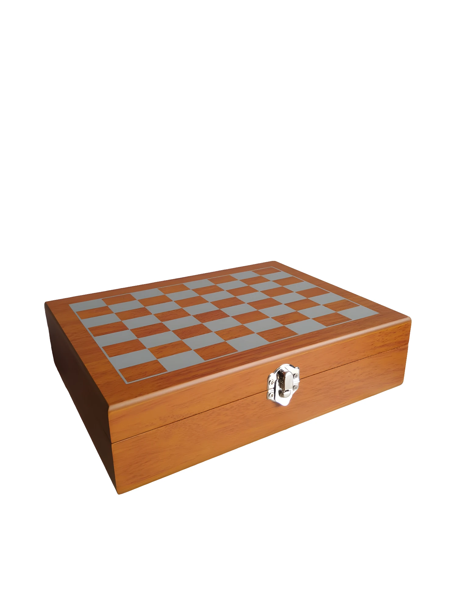- El set contiene un juego completo de piezas de ajedrez, una licorera con capacidad de 8 onzas, dos copas de 2 onzas, un embudo de acero inoxidable y un encendedor de mecha sin carga, todo organizado en un elegante cofre de madera.