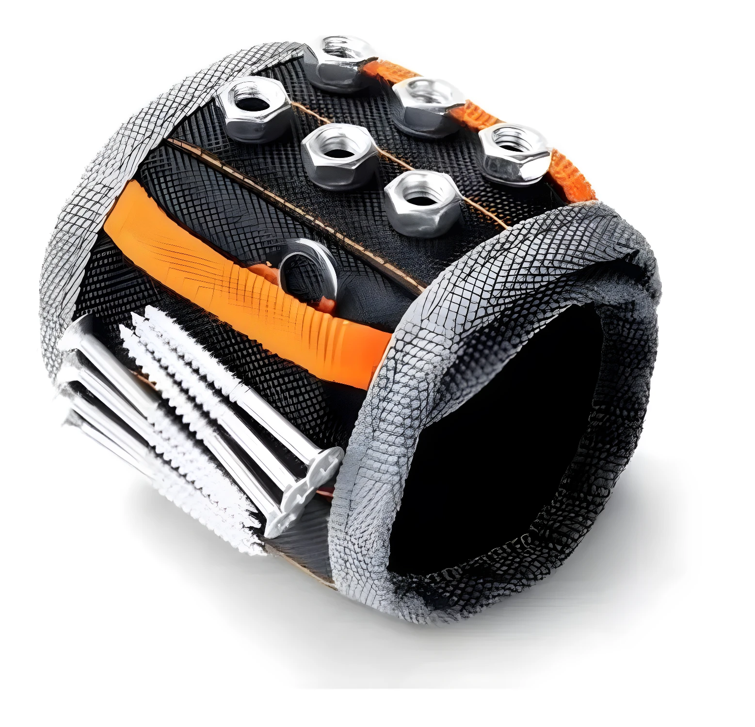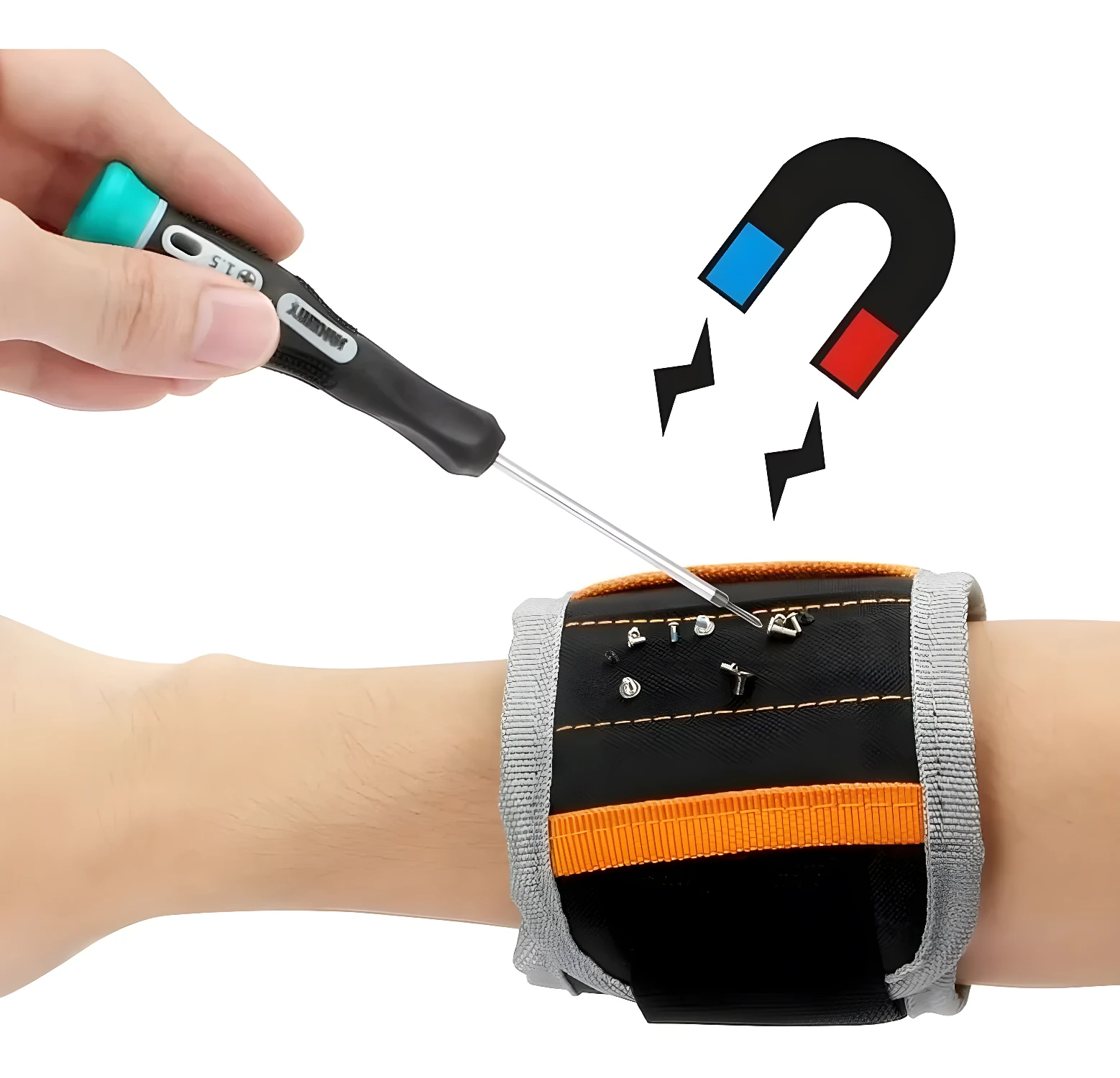 - Este brazalete es ideal para sujetar de forma segura tornillos, tuercas, tijeras y diversas herramientas pequeñas de metal gracias a sus potentes imanes. Además, incluye dos bolsillos prácticos para guardar objetos no magnéticos, ampliando así su utilidad en diferentes proyectos como carpintería, construcción o reparaciones.