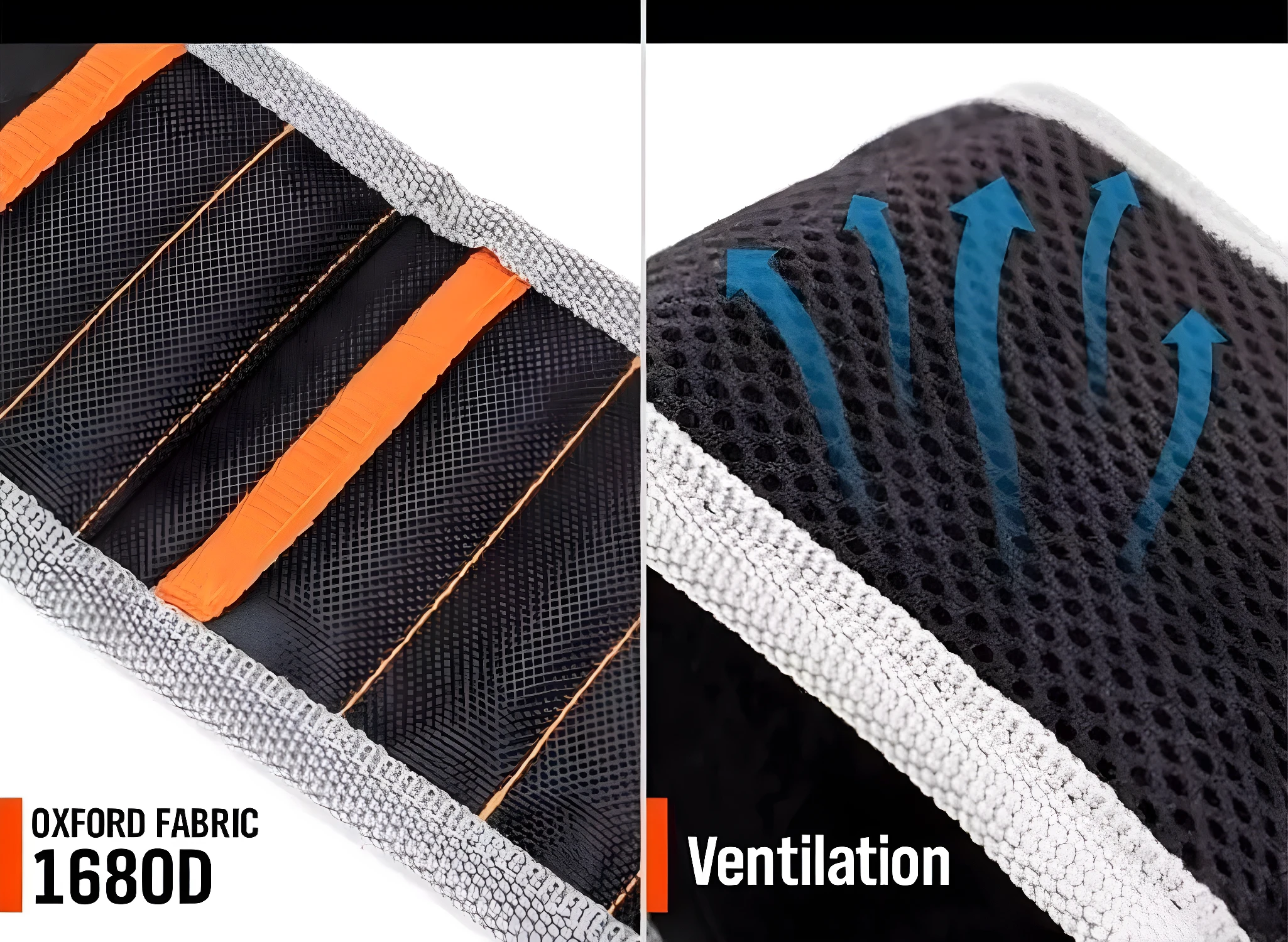 - El brazalete magnético está fabricado con poliéster balístico 1680D, un material de alta calidad reconocido por su durabilidad y resistencia. Además, es transpirable y seguro para usar durante todo el día, garantizando comodidad y fiabilidad.
