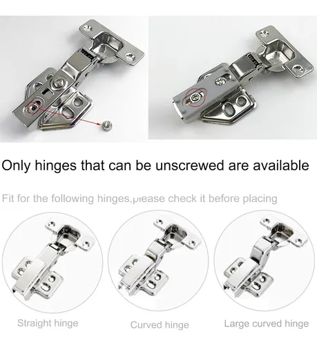 - ✔️ Compatibilidad: Se adapta a la mayoría de bisagras estándar atornillables (bisagras rectas, curvadas y curvadas grandes).