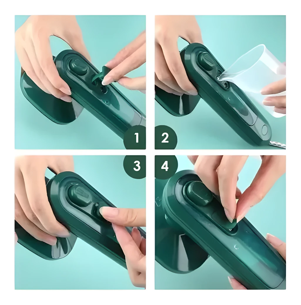 - 2️⃣ Llena con Agua: Utiliza el pulverizador gratuito incluido para llenar el tanque de agua con cuidado.