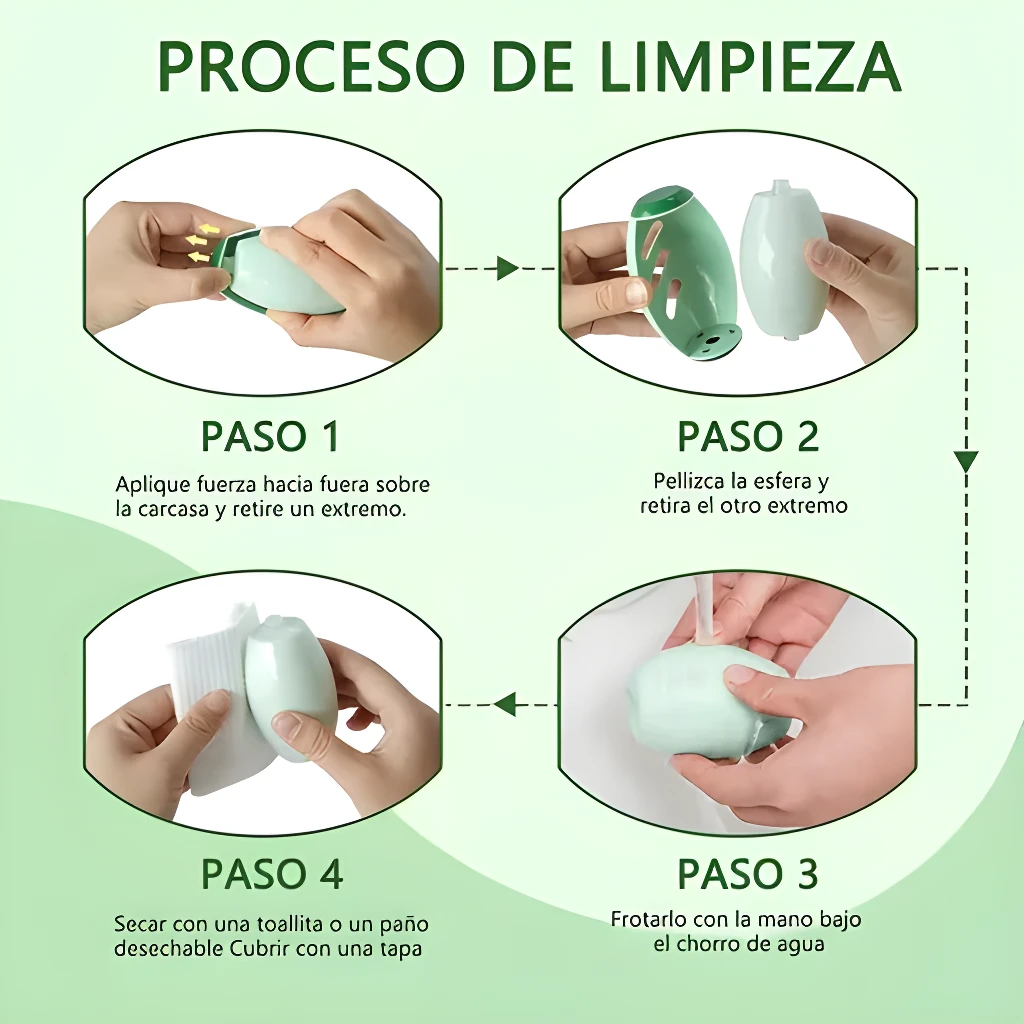 - 3️⃣ Lavar: Frota la esfera adhesiva con la mano bajo el chorro de agua hasta que esté completamente limpia y sin residuos.