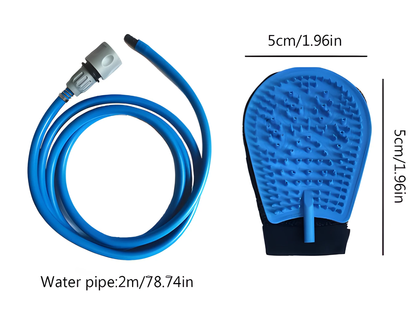 - 1️⃣ Conexión: Conecta la manguera del guante a una fuente de agua (grifo de baño, lavadero o manguera de jardín) utilizando los adaptadores incluidos para asegurar un ajuste firme.