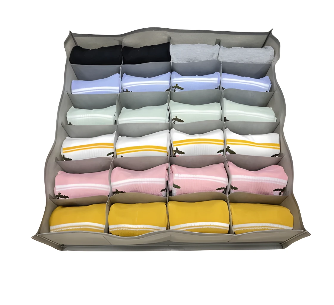 - ✅ Compartimientos Espaciosos y Modificables: Diseñado con una estructura versátil que permite crear 24 compartimientos ideales para organizar calzoncillos, calcetines, corbatas o piezas pequeñas, o adaptarlos a 6 compartimientos más grandes, perfectos para sujetadores, pijamas o prendas de mayor volumen.