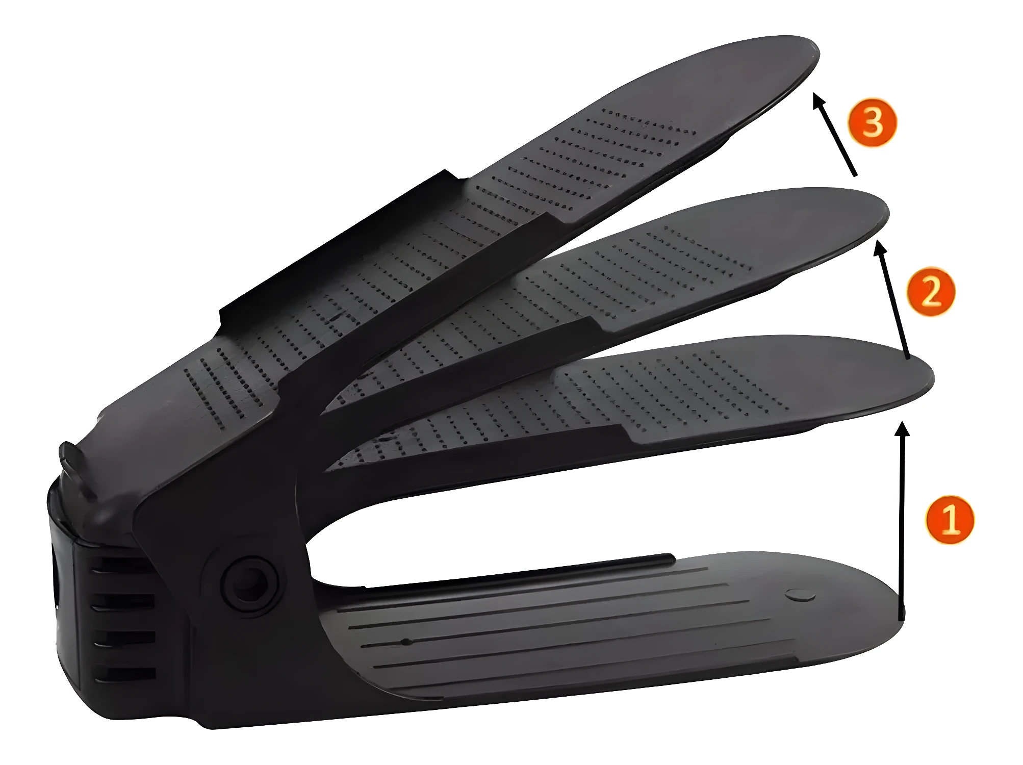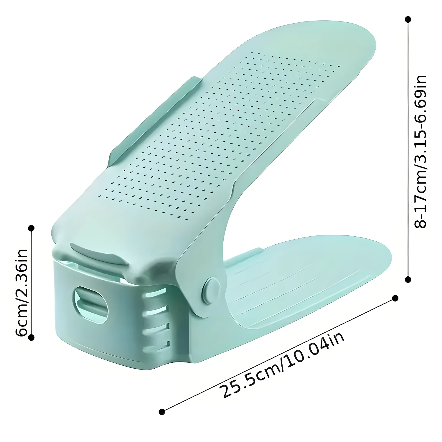- Cada módulo organizador tiene un largo de 25.5 cm y un ancho de base de 6 cm. Además, su altura es ajustable, variando entre 8 y 17 cm, lo que permite acomodar diferentes tipos de calzado y aprovechar el espacio disponible de manera eficiente.