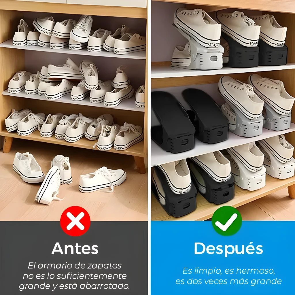 - El Set x4 Organizador de Zapatos está diseñado para duplicar la capacidad de almacenamiento de su calzado. Al apilar un zapato sobre otro de forma segura y ordenada, le permite optimizar el espacio vertical en su zapatero, clóset o vestidor, manteniendo cada par visible y accesible.
