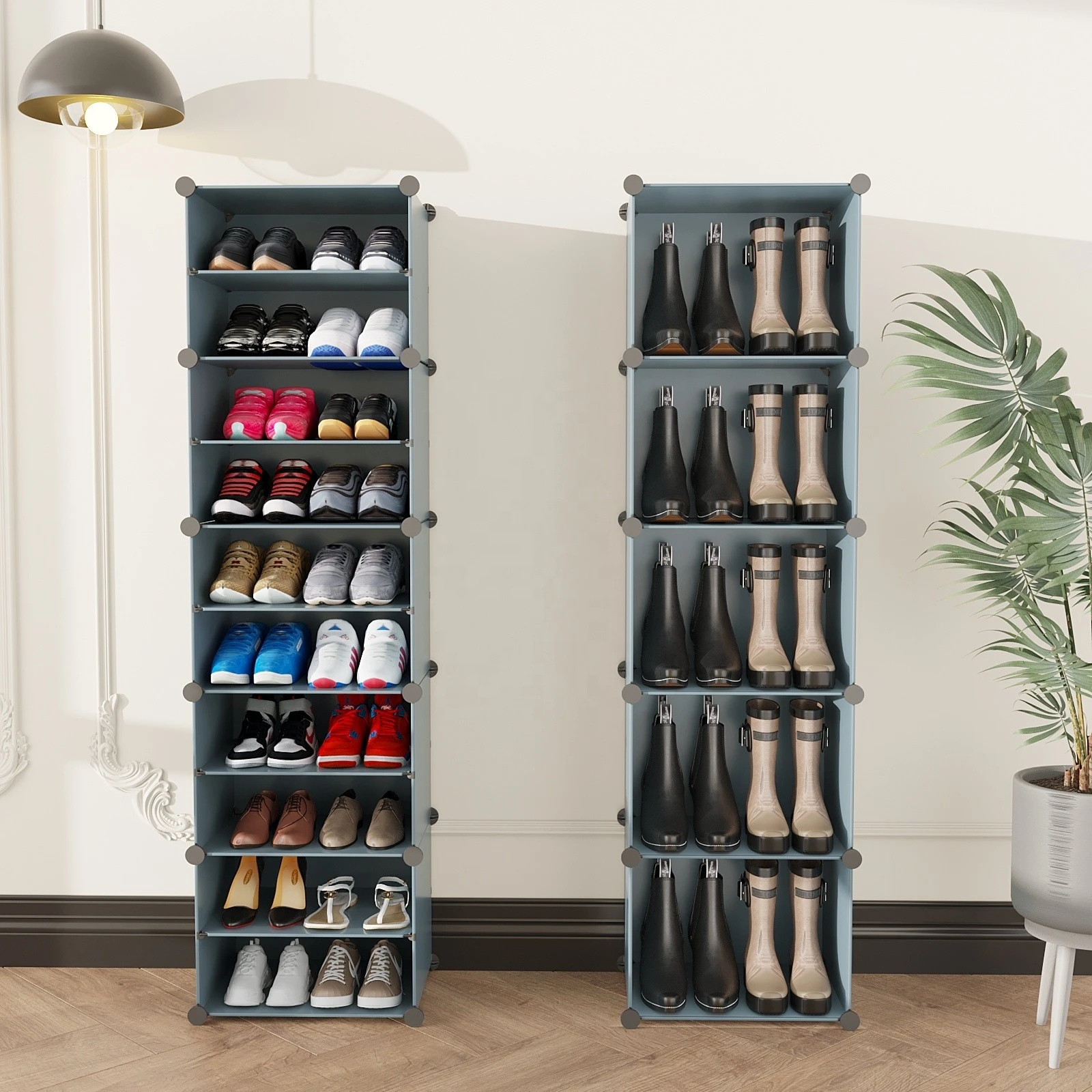 - Gracias a su diseño modular, puede ajustar algunos compartimentos para calzado más alto como botas, o utilizar la configuración dividida del zapatero para acomodar diferentes tipos de zapatos cómodamente.