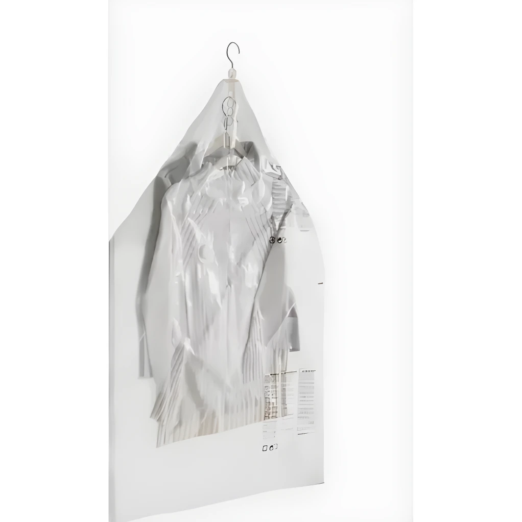 - 1️⃣ Coloca la ropa dentro de la bolsa, asegurándote de que los ganchos queden en su lugar.