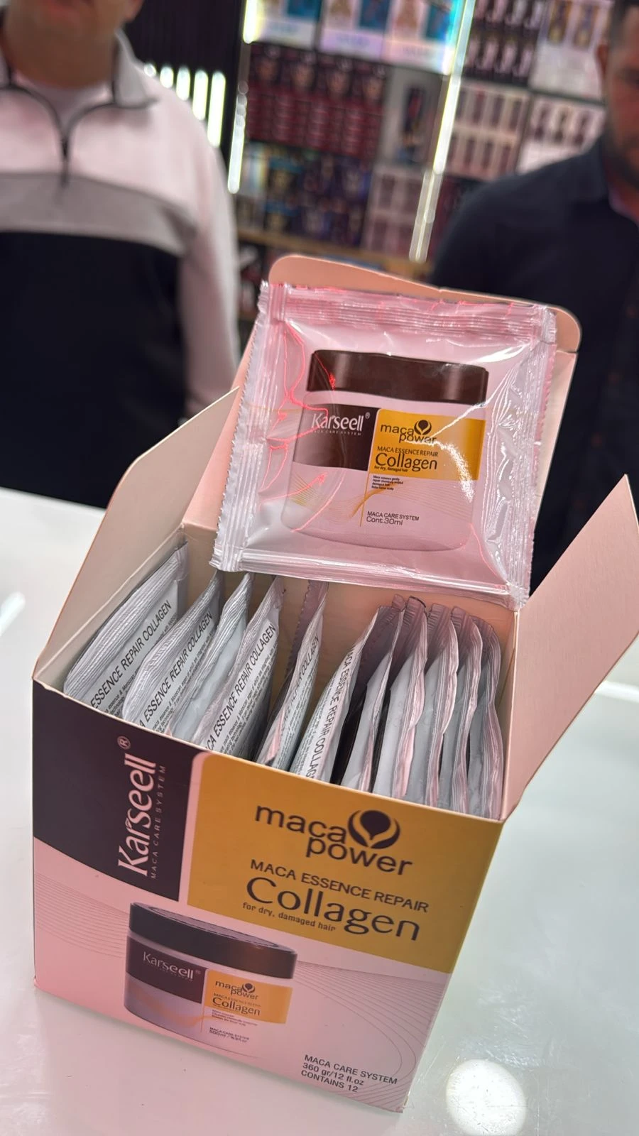 El tratamiento capilar KARSEELL Maca Power Collagen es una mascarilla reparadora en sobres individuales, diseñada para combatir el cabello seco y dañado. Formulada con esencia de maca y colágeno, restaura la vitalidad, hidrata profundamente y relaja el cuero cabelludo, mejorando la textura y el brillo del cabello tratado químicamente.