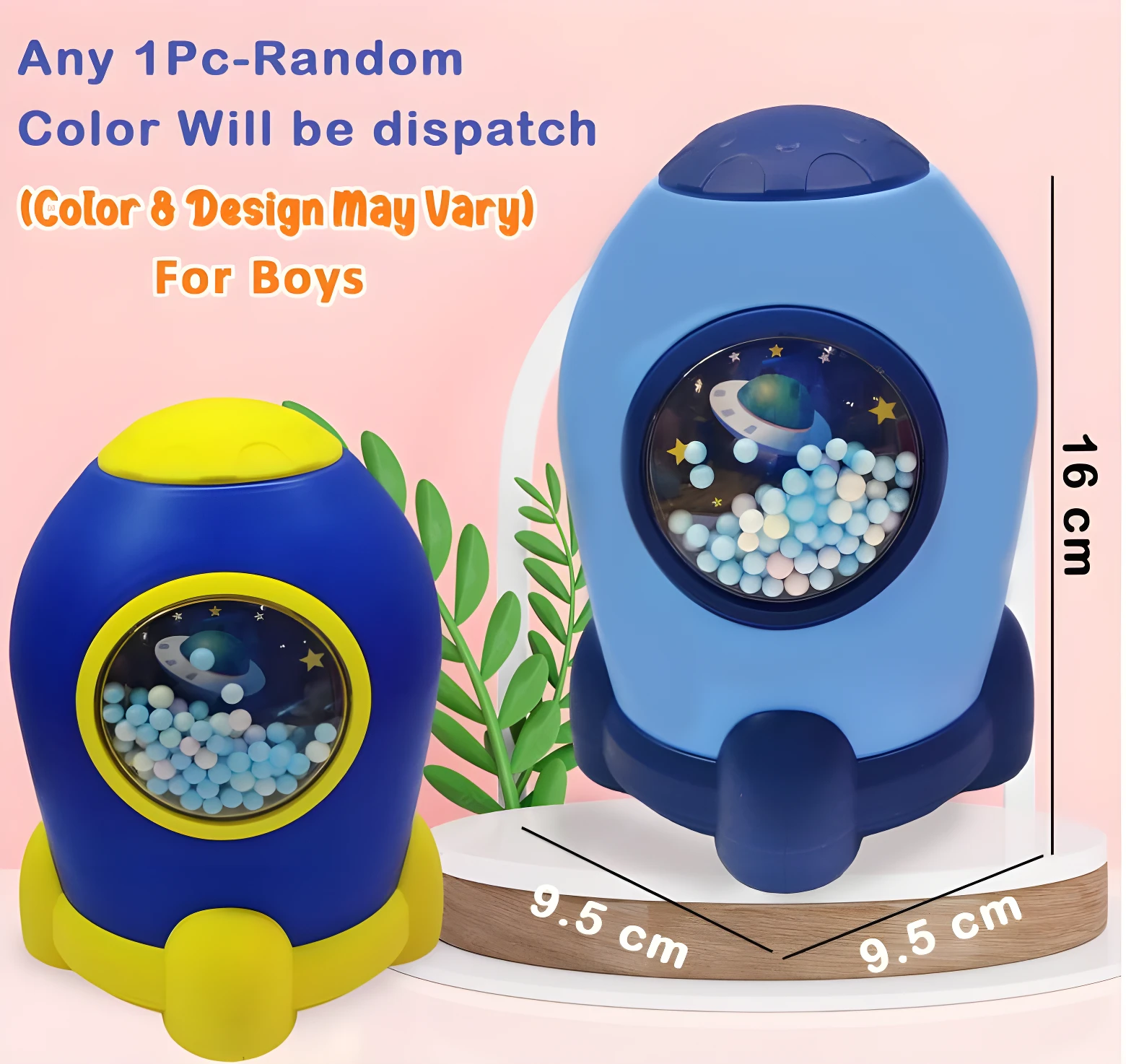 - ☑️ 1 Alcancía de plástico con forma de cohete (Color y diseño al azar).