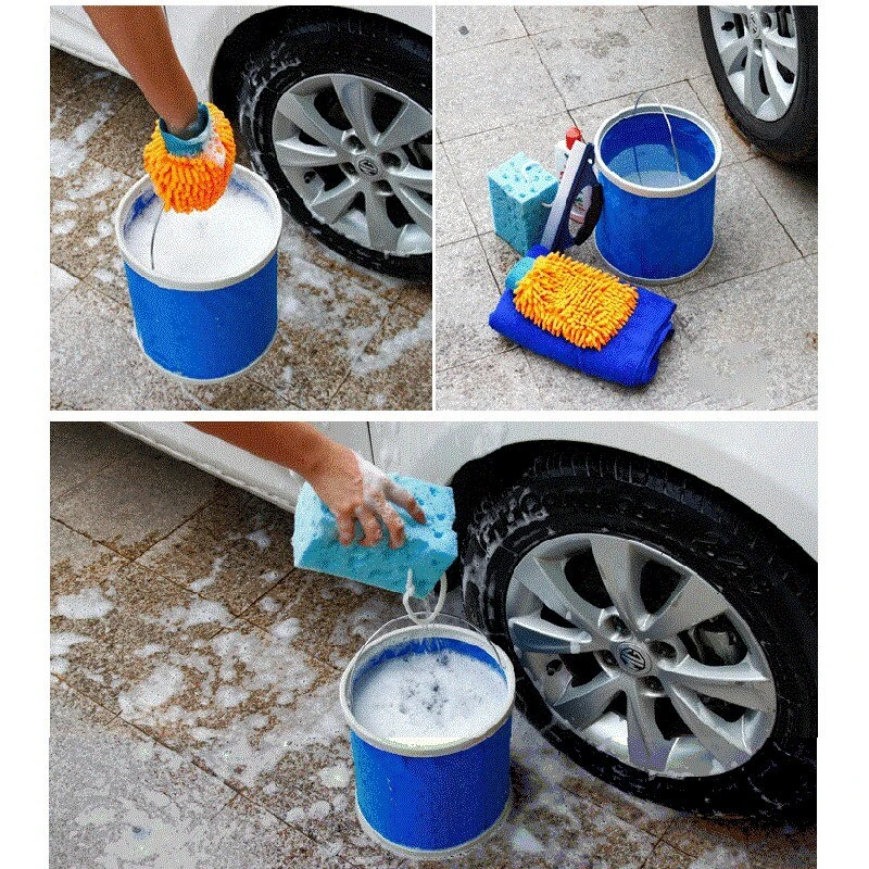 El balde de agua plegable es un recipiente portátil fabricado con tela Oxford e interior impermeable PVP, diseñado para camping, actividades exteriores y uso automotriz. Su diseño compacto y ligero facilita el transporte y almacenamiento, ofreciendo una capacidad de 9 a 11 litros para diversas tareas.
