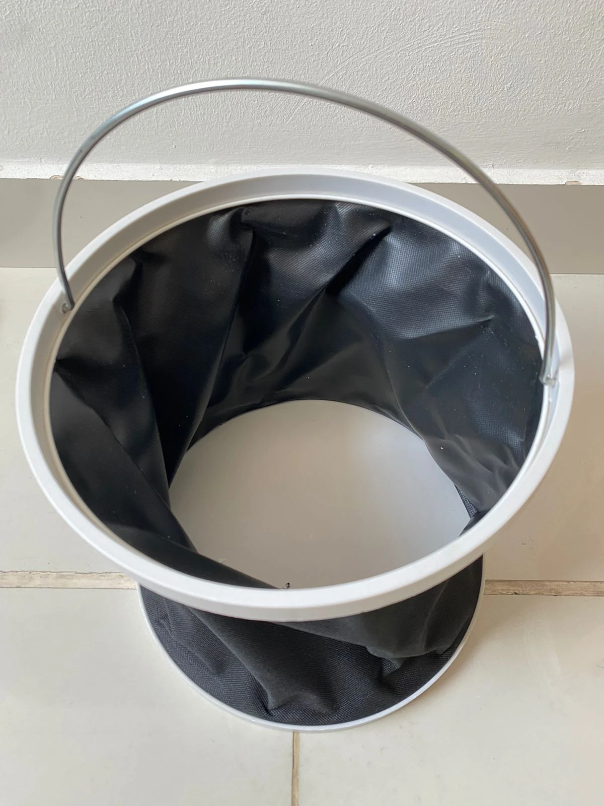 - 1️⃣ Desdobla completamente el balde tirando de la base y el borde superior.
