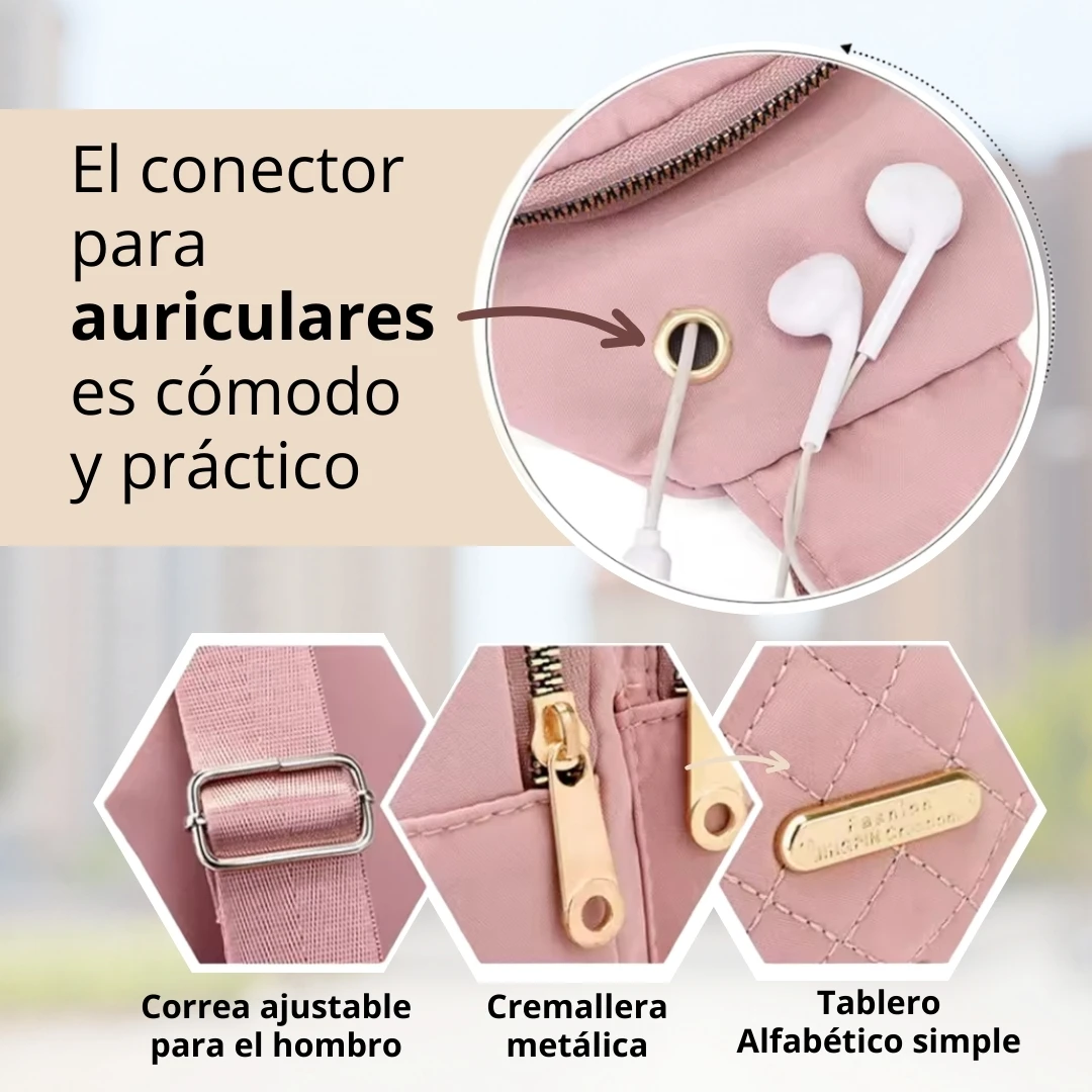 - Permite pasar el cable de los auriculares desde el dispositivo guardado dentro del bolso hacia el exterior sin dejar el bolso abierto.
