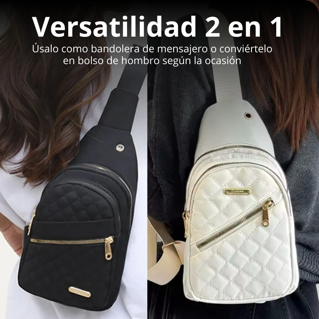 - 1️⃣ Coloque el bolso sobre el pecho o espalda cruzando la correa por el hombro deseado.