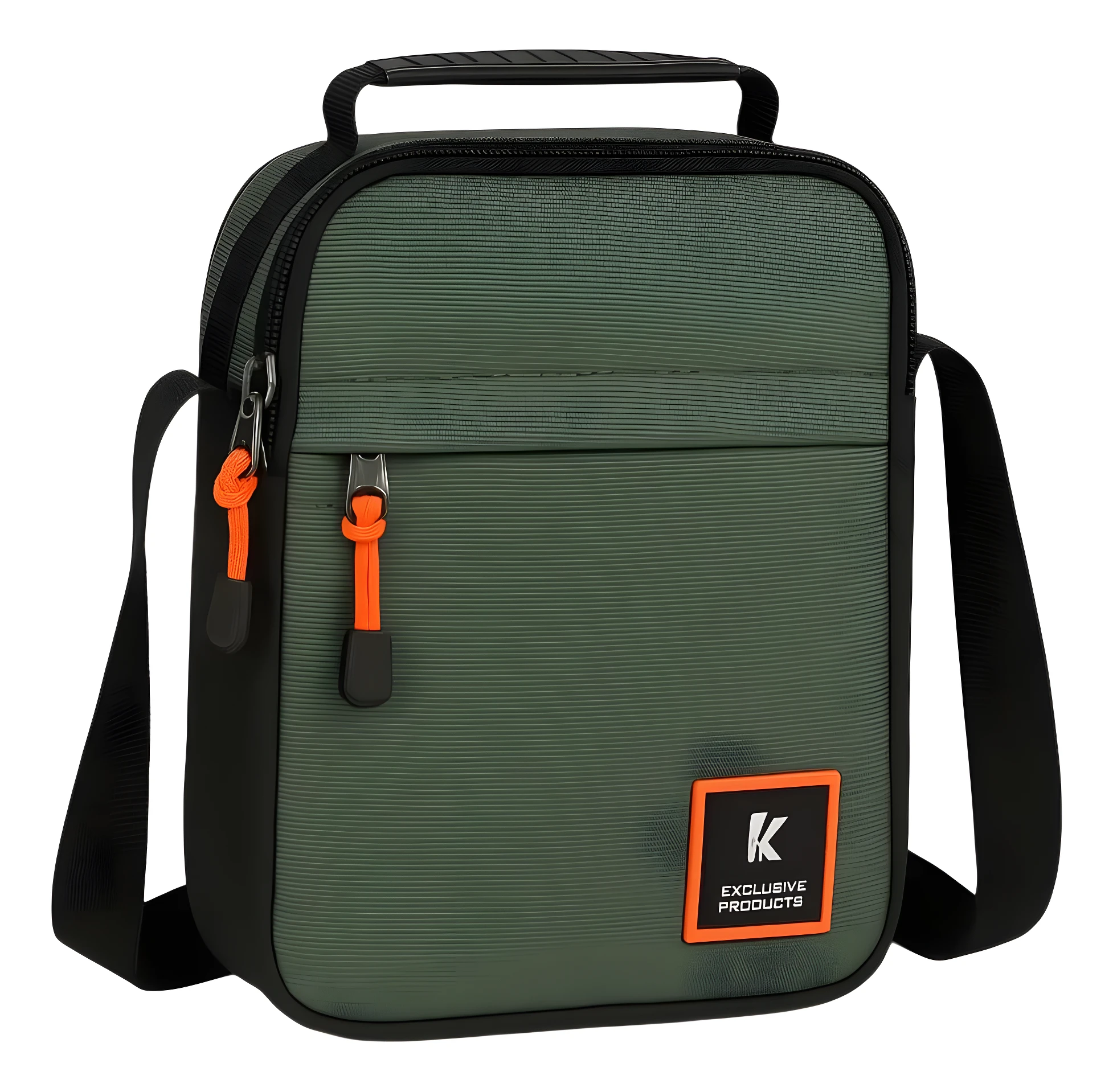 - El diseño combina el color principal (verde oliva en una vista y negro en otra) con detalles en negro y naranja.