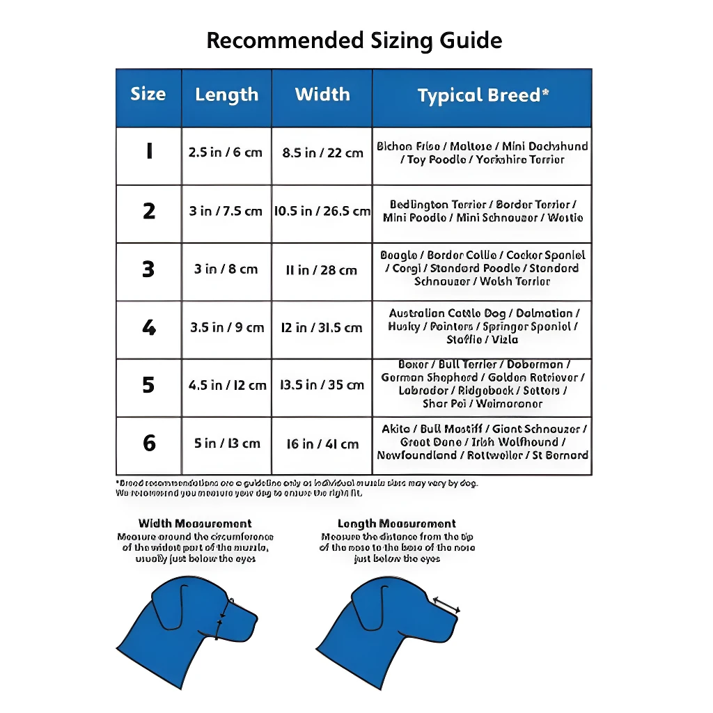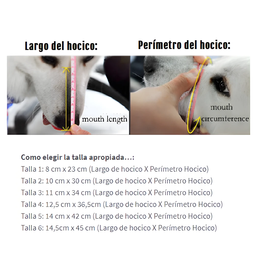 - Consulta la guía de medidas para seleccionar la talla adecuada según el largo y ancho del hocico de tu perro.