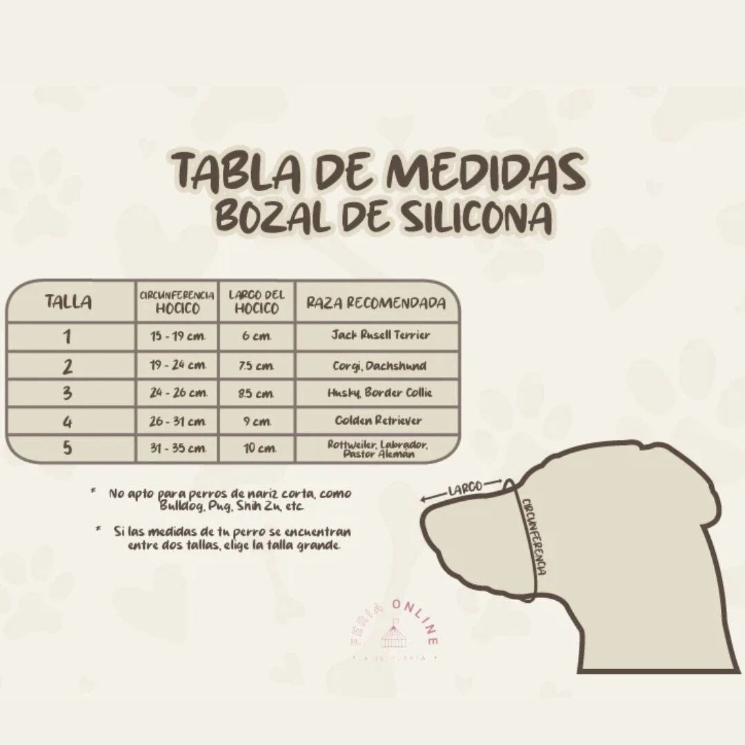 | Talla | Circunferencia Hocico | Largo Hocico | Raza Recomendada |