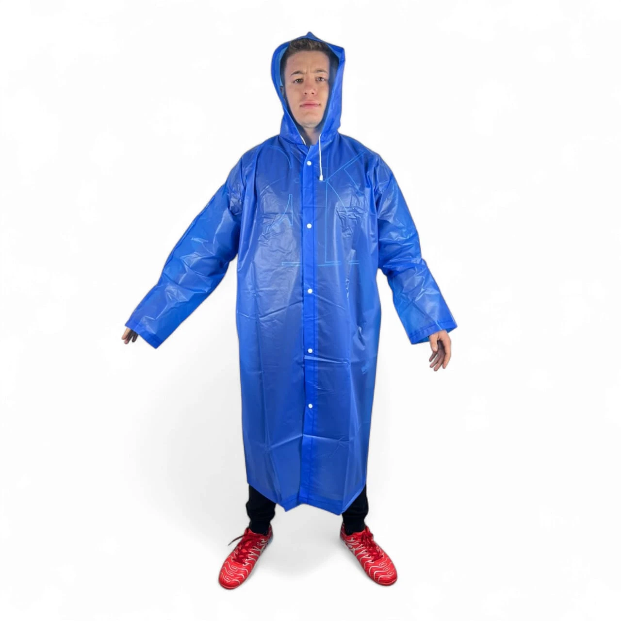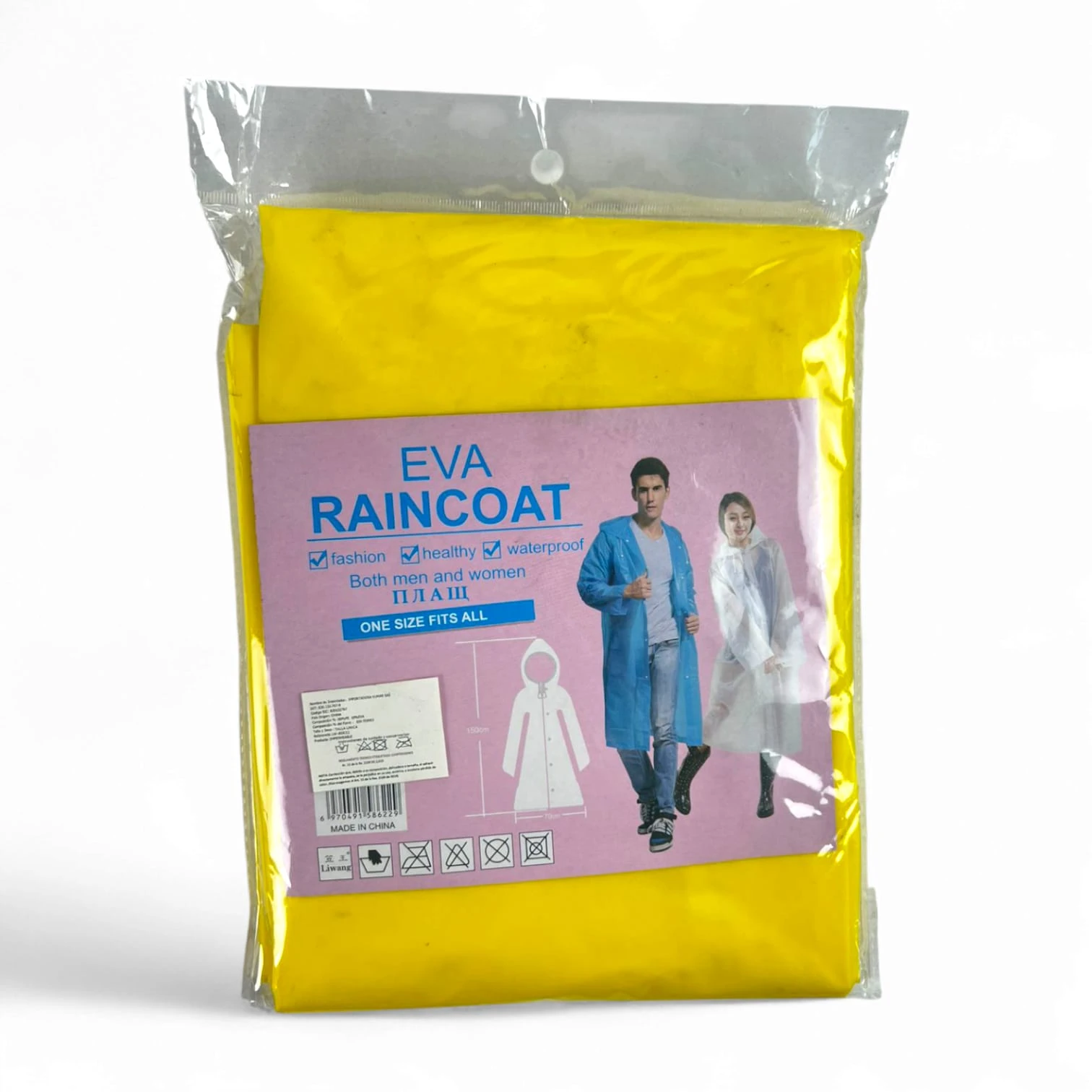 Este es un set de dos capas impermeables para adulto, fabricadas en material EVA, diseñadas para ofrecer protección total contra la lluvia. Son una talla única, adaptables a hombres y mujeres, ideales para proteger tu ropa de forma práctica y ligera ante cualquier imprevisto climático.
