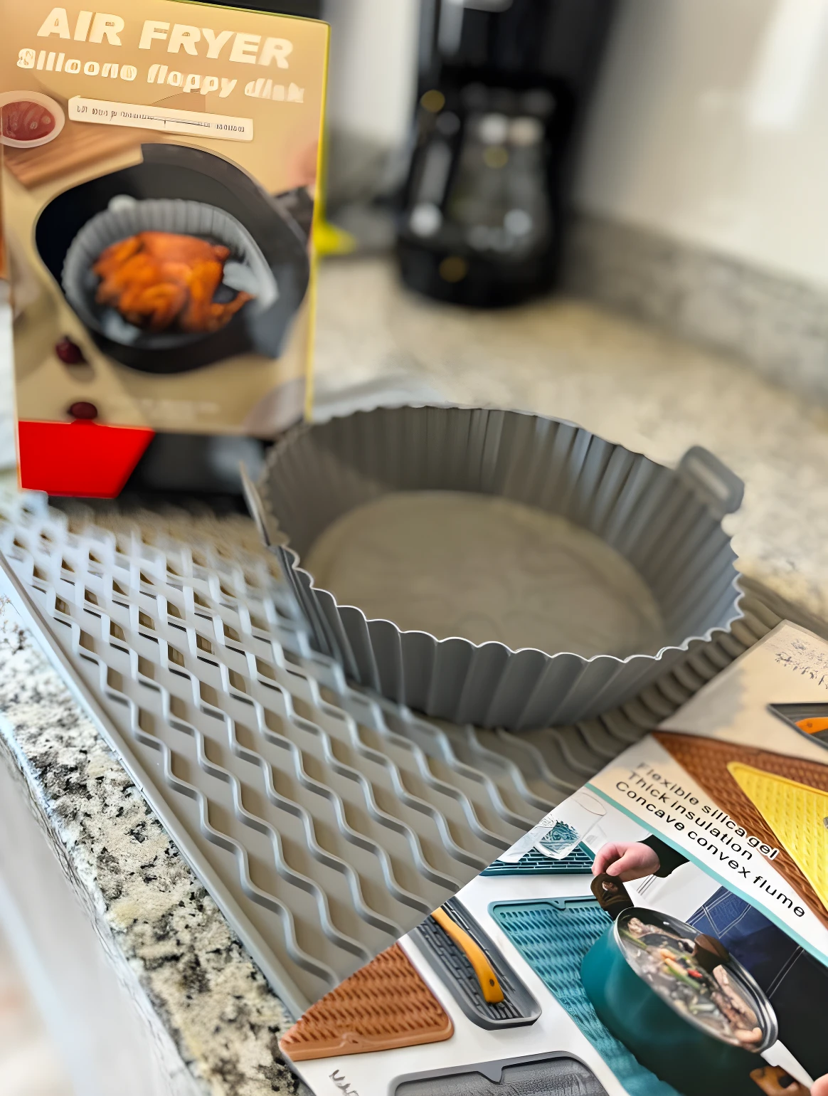 - 1️⃣ Coloca el molde de silicona en la base de tu freidora de aire antes de insertar los alimentos.