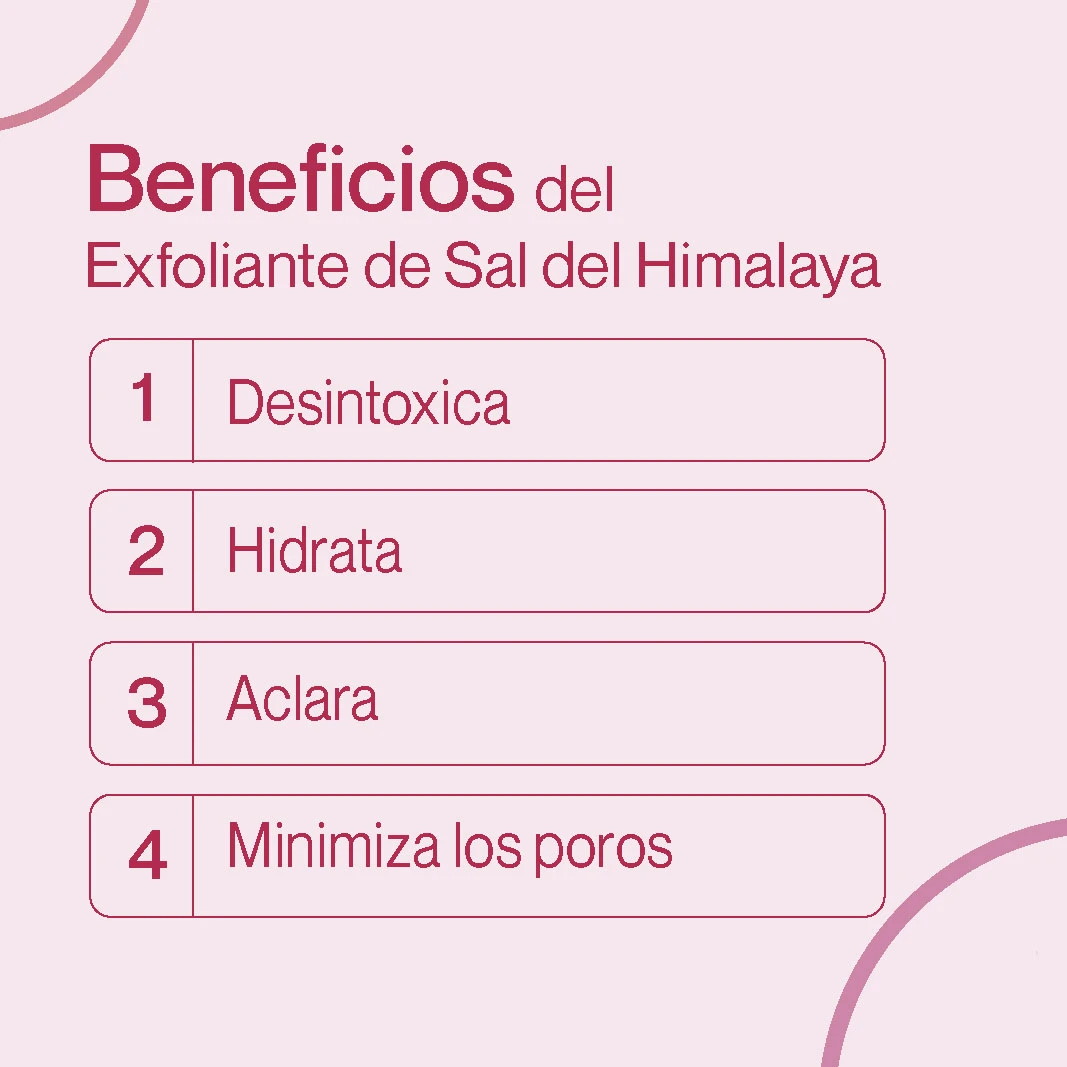 - La sal del Himalaya aporta minerales esenciales que ayudan a desintoxicar la piel, equilibrar su pH y restaurar la suavidad, además de actuar como minimizador de poros.