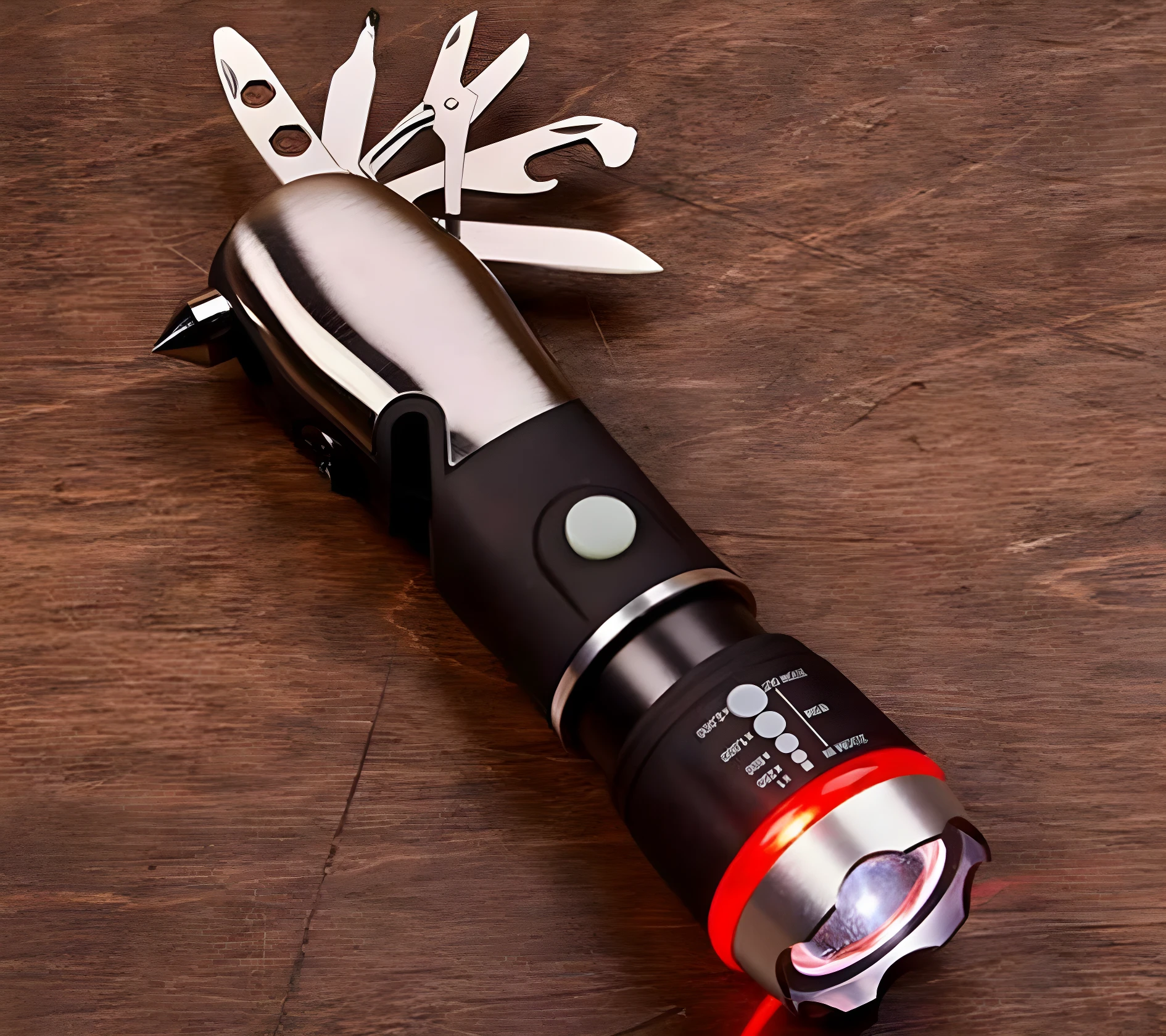 - Incluye cortador de cinturón, rompevidrios, cuchillo, abridor y destornillador.