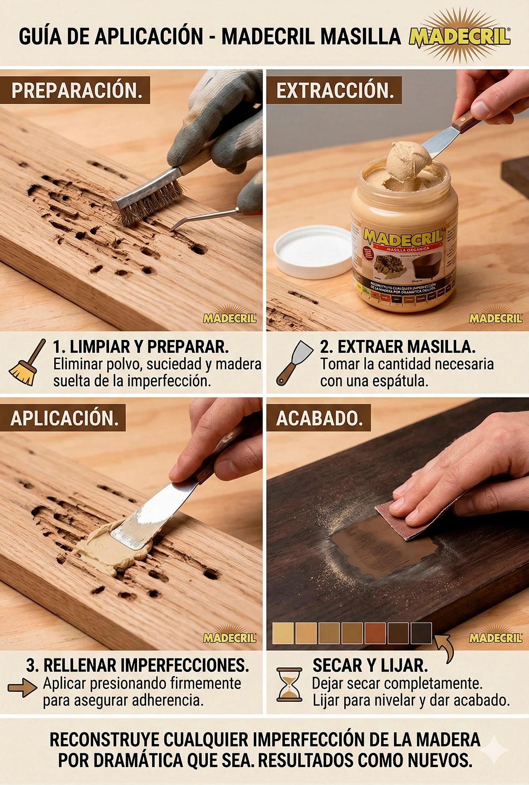 - ✨ Permite igualar el color de la madera antes del acabado final.