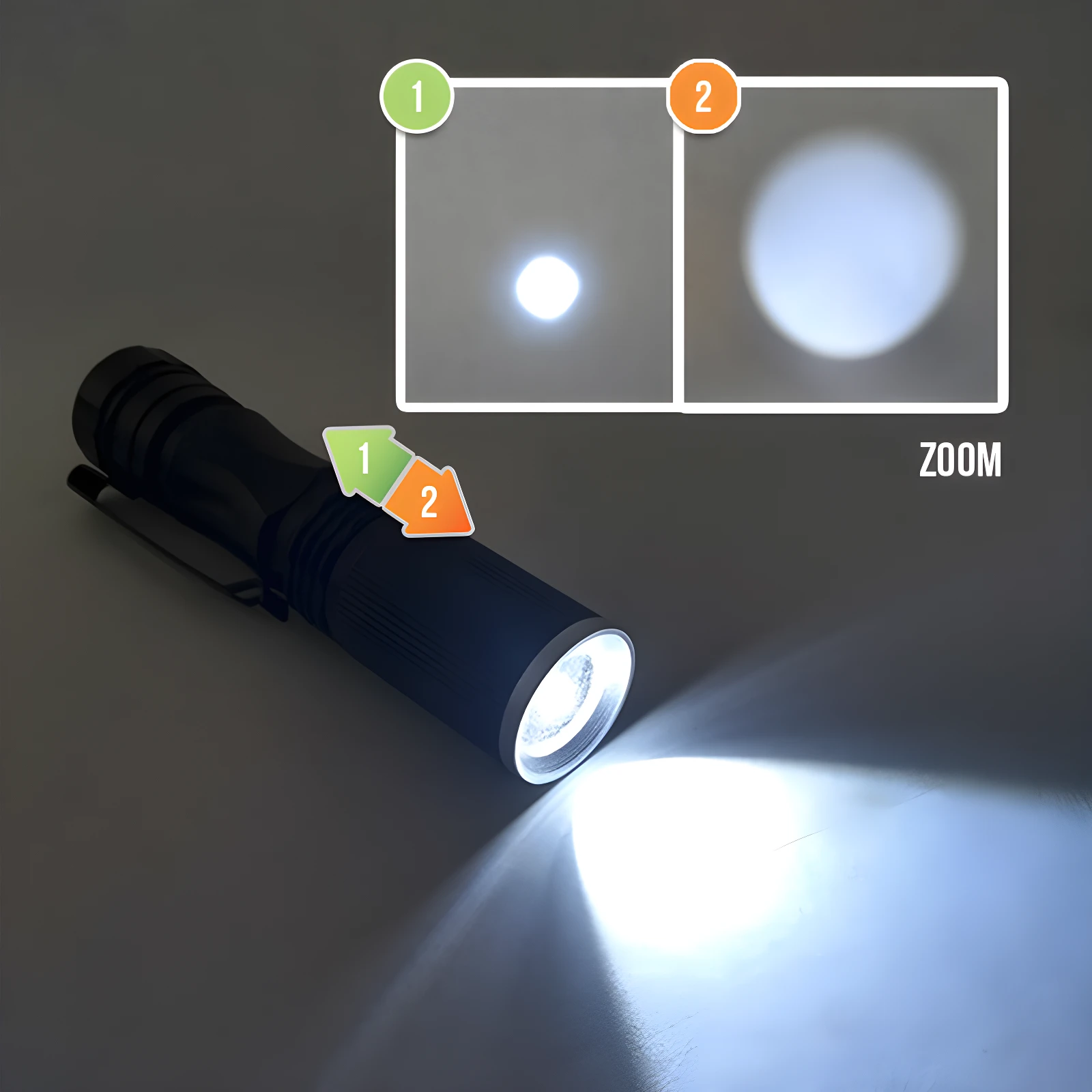 - 4️⃣ Deslice el cabezal de la linterna hacia adelante o hacia atrás para ajustar el zoom del haz.
