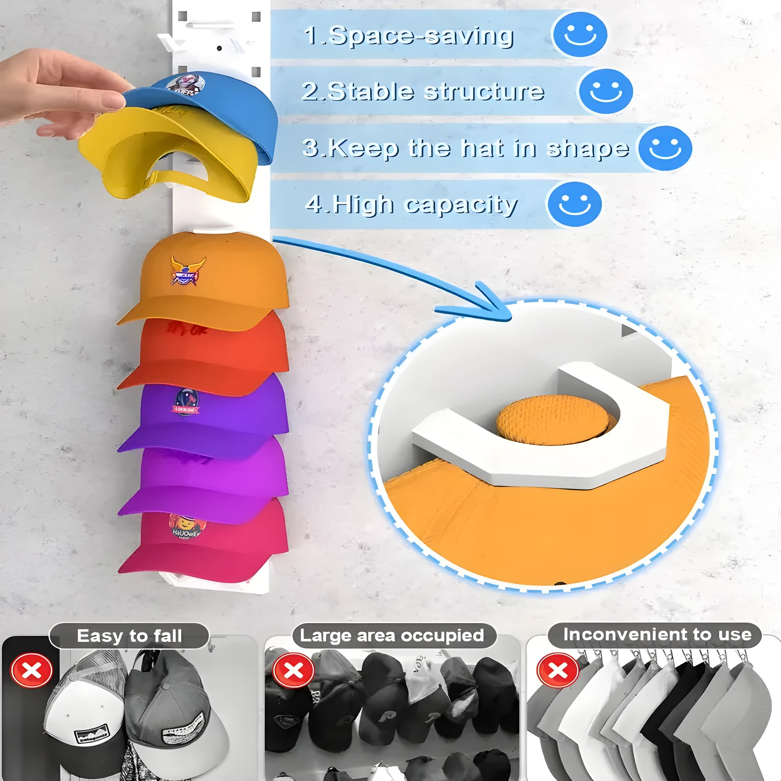 - El diseño de espaciado amplio facilita tomar o colocar cualquier gorra sin mover las demás.