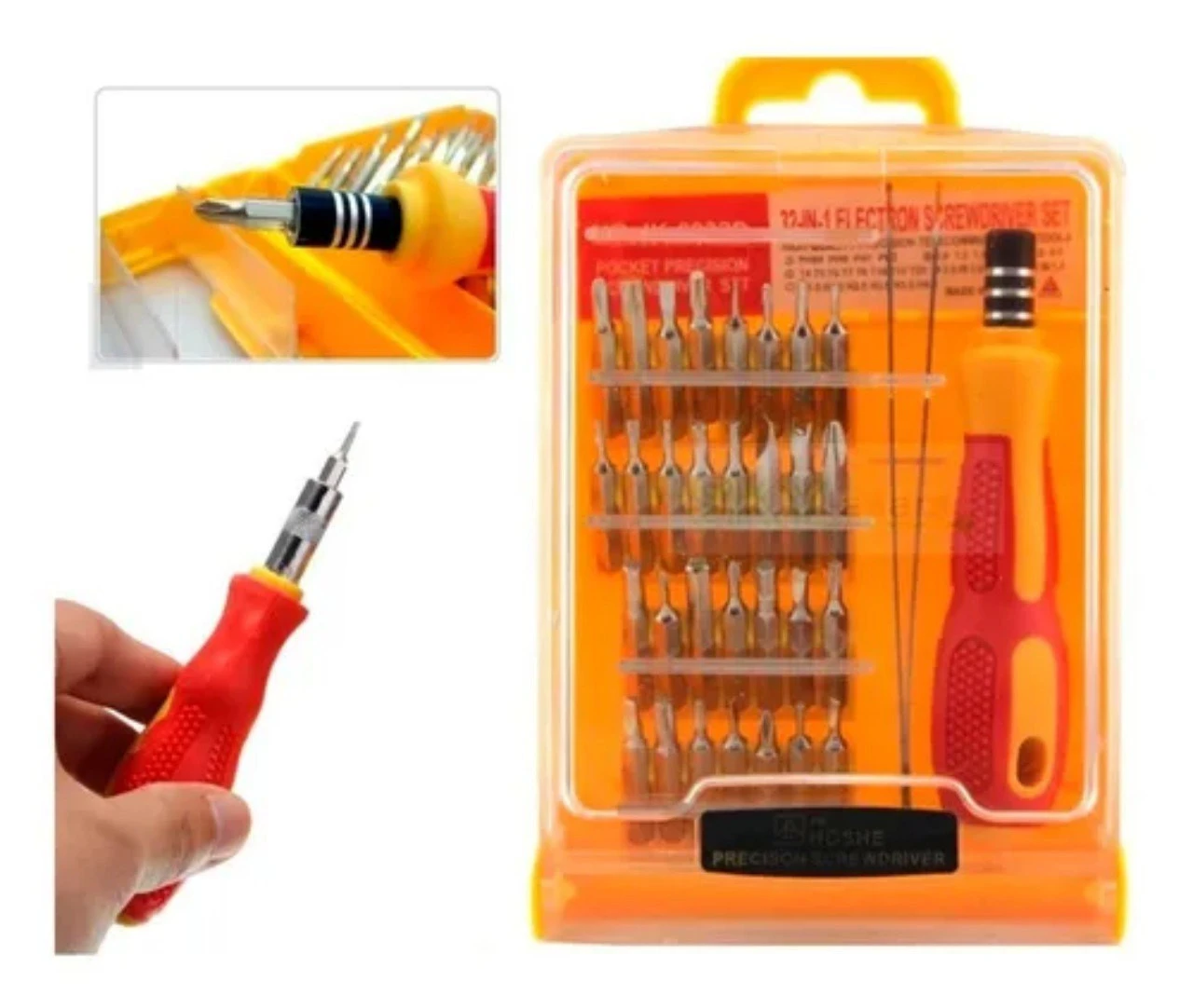 - ✅ Set de precisión compuesto por 32 piezas intercambiables.