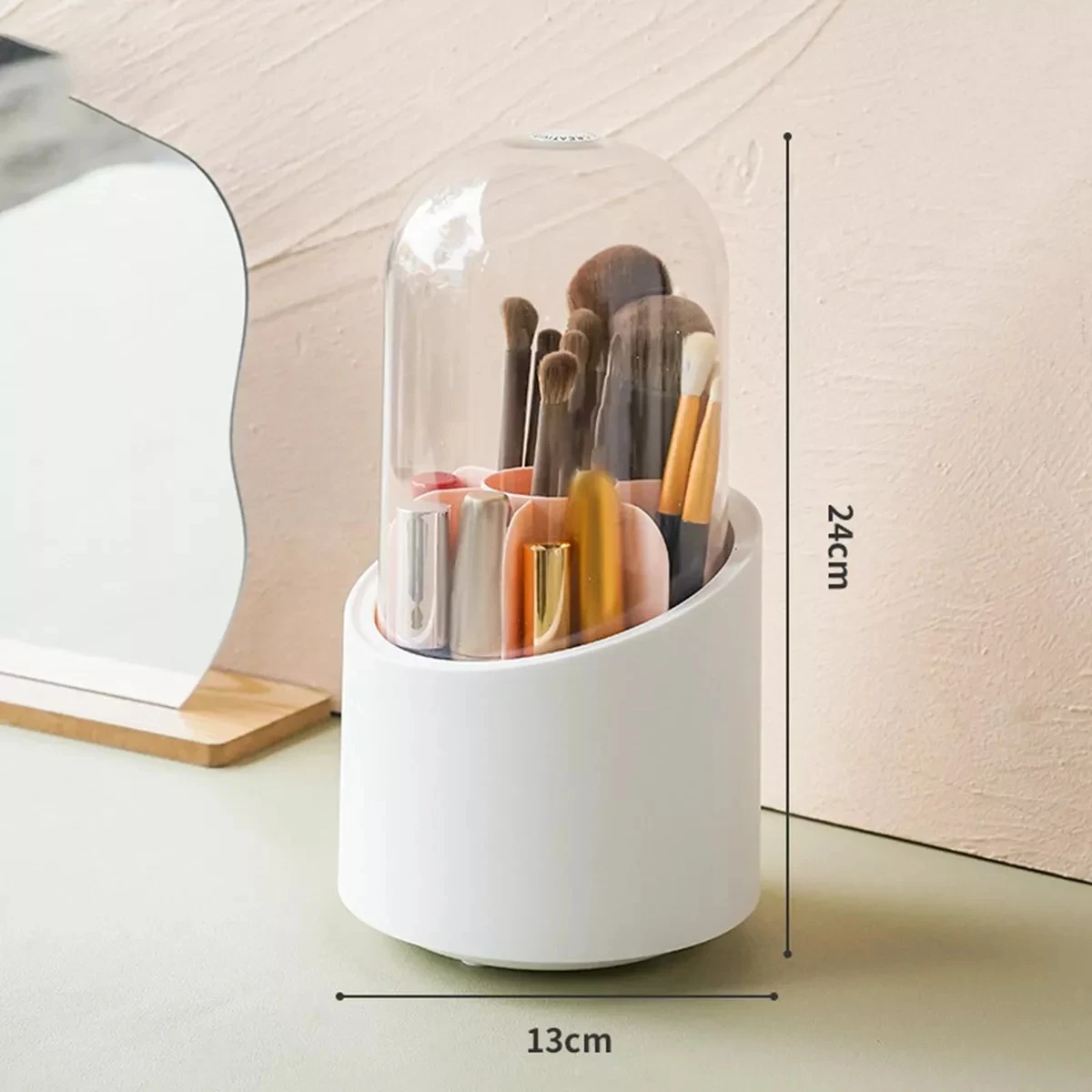 - ✅ Tapa Transparente Antipolvo: Incluye una cúpula transparente de PET que protege tus brochas y cosméticos del polvo y la humedad, manteniéndolos limpios e higiénicos.