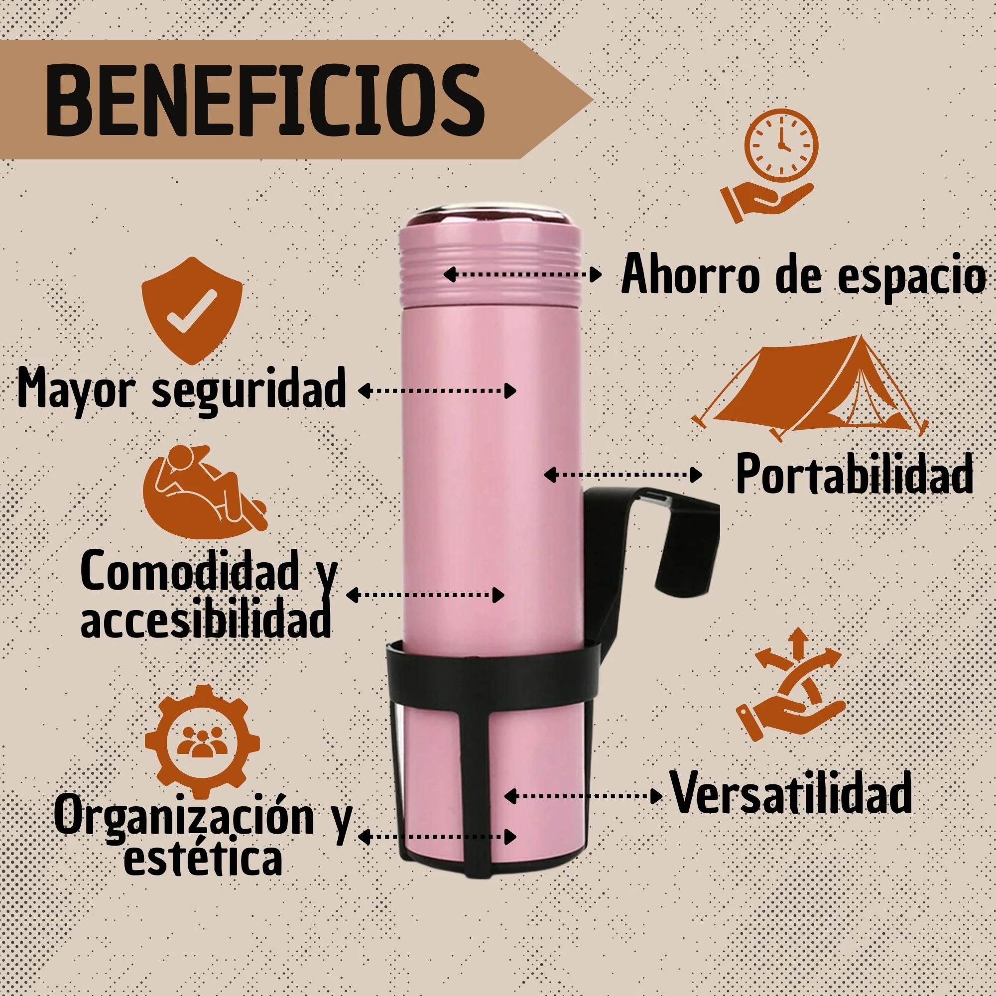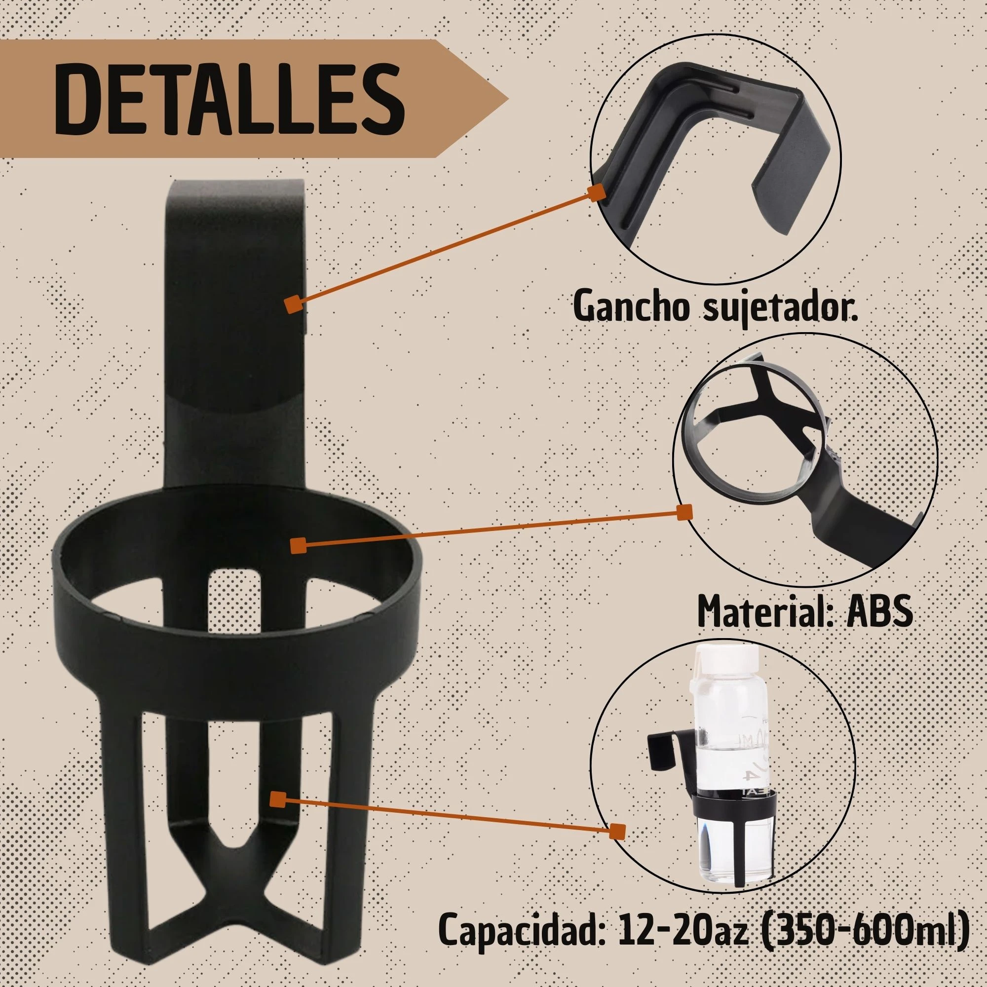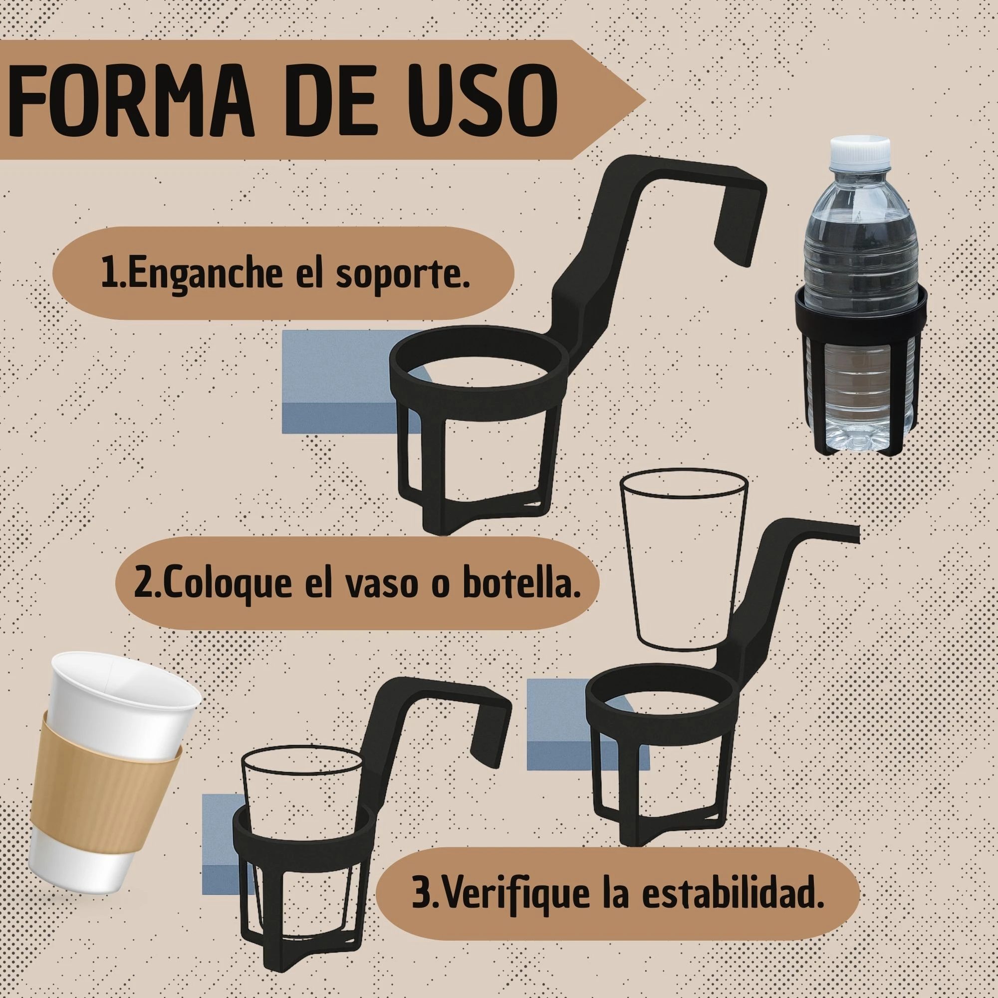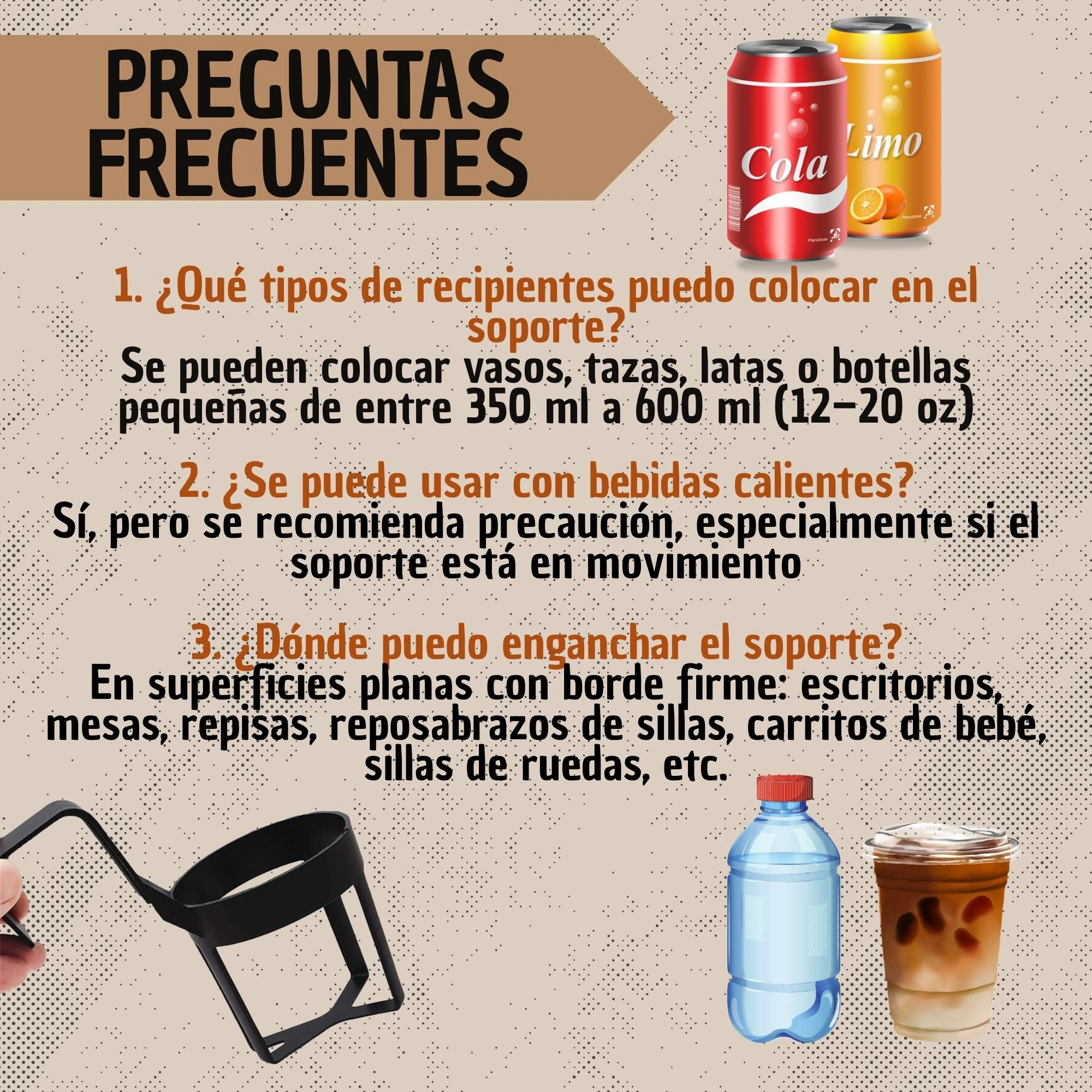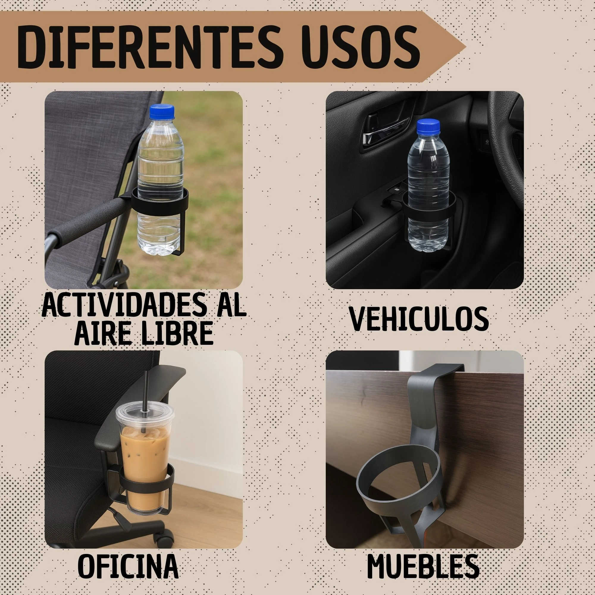 - 🚗 Sujeción de bebidas en el interior de vehículos.