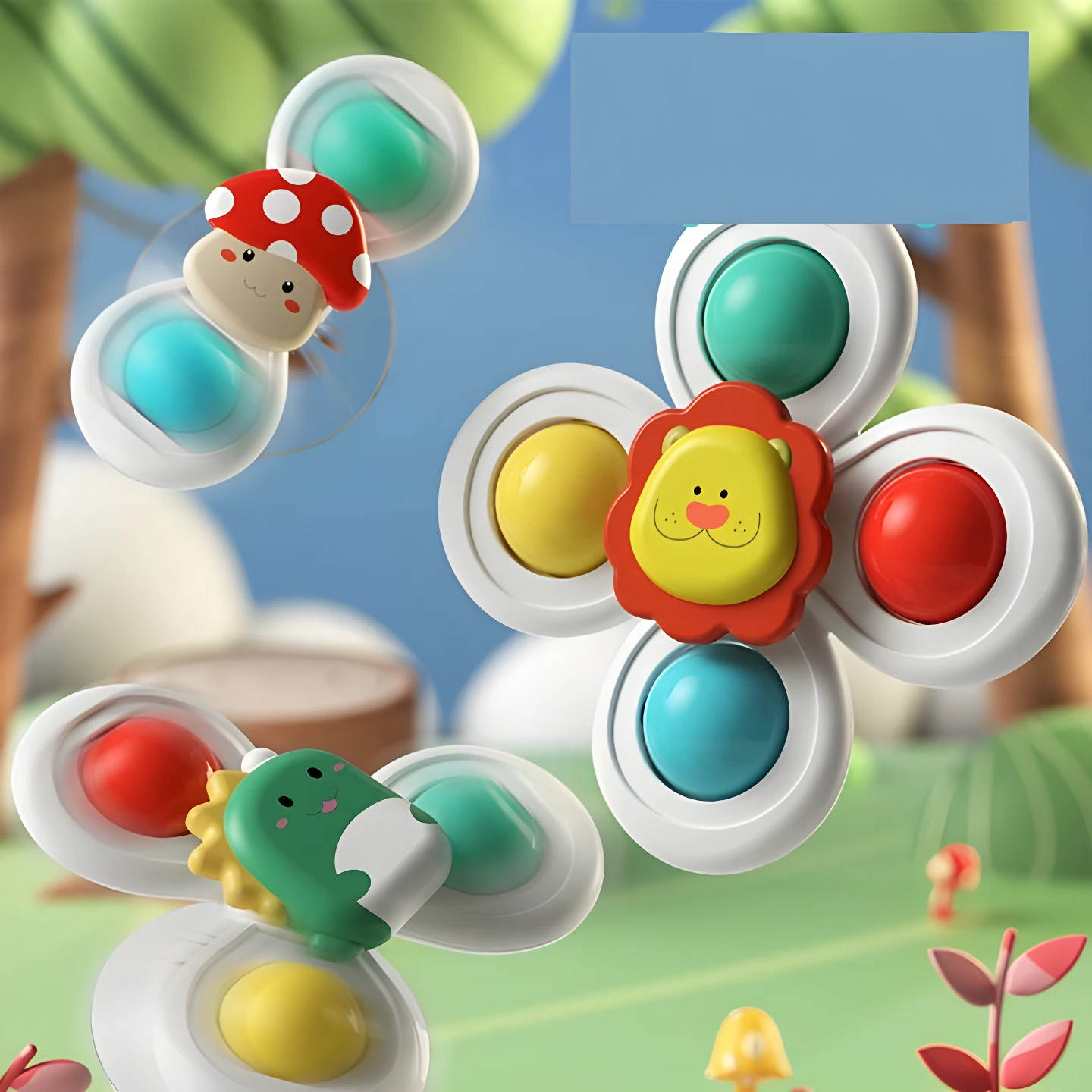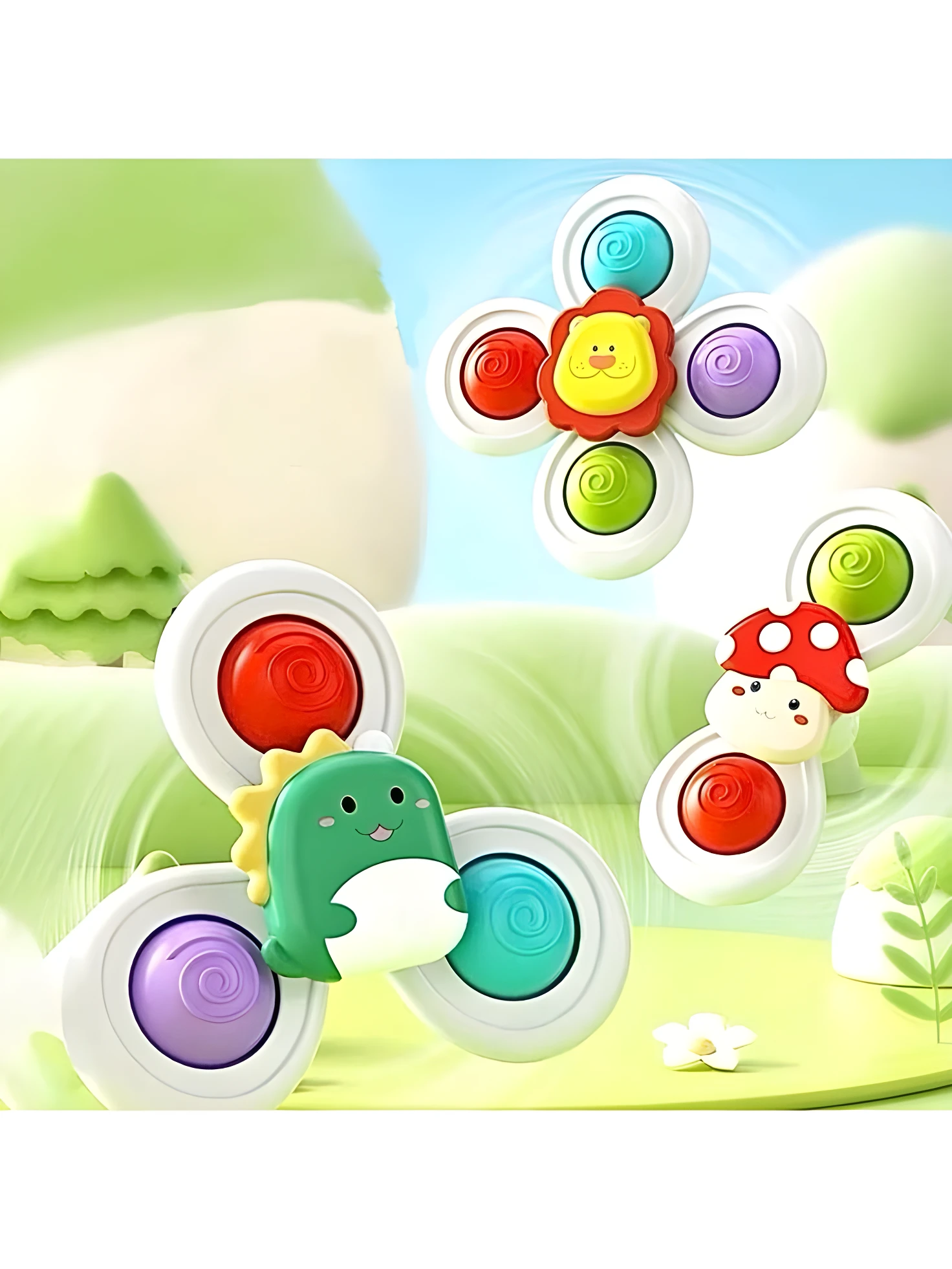- ☑️ Set de 3 juguetes giratorios con ventosa.