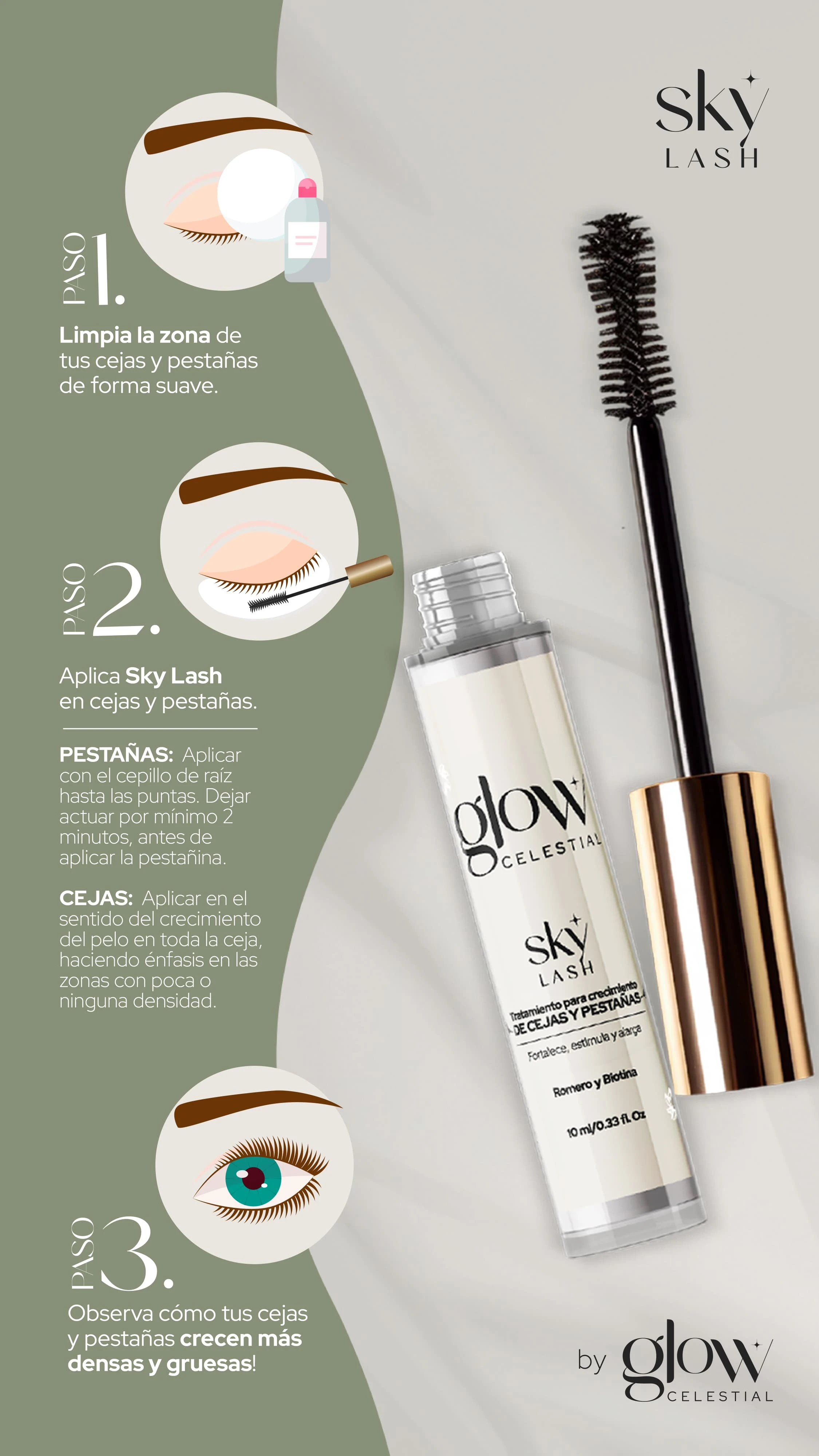 - 2️⃣ Aplica Sky Lash en cejas y pestañas. PESTAÑAS: Aplicar con el cepillo de raíz hasta las puntas. Dejar actuar por mínimo 2 minutos antes de aplicar la pestañina. CEJAS: Aplicar el producto en el sentido del crecimiento del pelo en toda la ceja, haciendo énfasis en las zonas con poca o ninguna densidad.