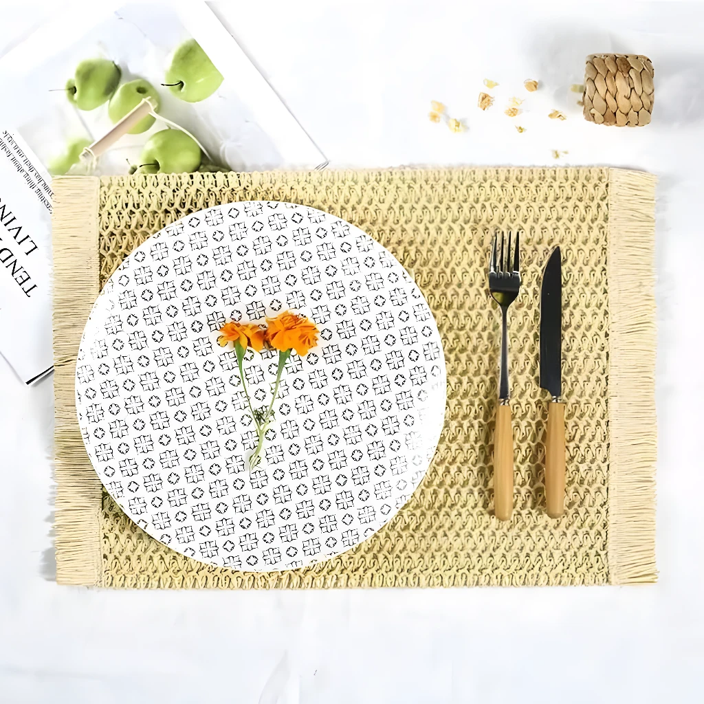 - 2️⃣ Disponga el plato principal centrado sobre el área tejida del individual.